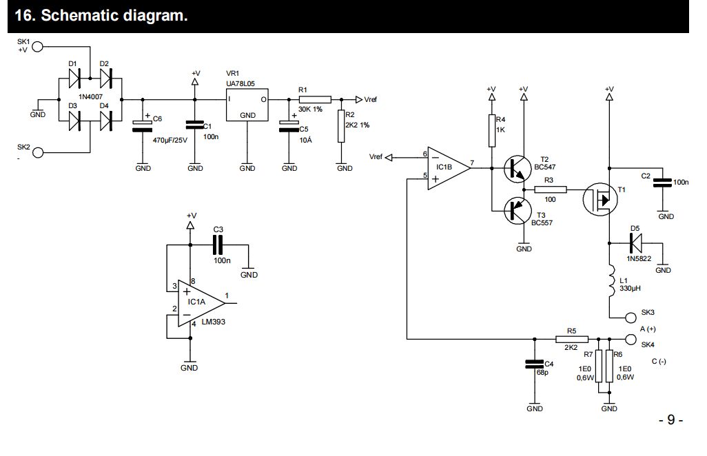 Siinä on vain vähän liian korkea käyttöjännite, ja sitä pitäisi hieman modifioida dynamokäyttöön, mutta periaate on näppärä, komparaattori piiriä käytetään oskillaattorina, tai siis kun ledin virta nousee yli rajan, transistori kytkeytyy pois ja siitä aikanaan seuraa että virta laskee rajan alle...