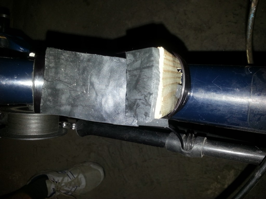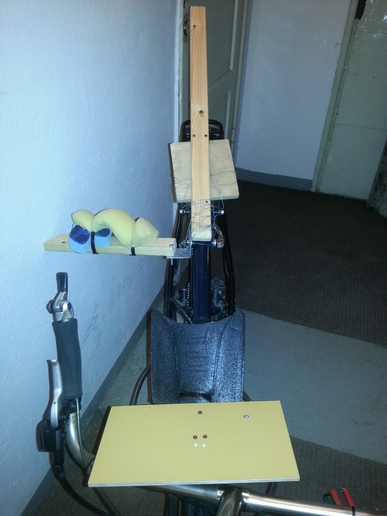 Poikkiriman ja niskatuen rungon korkeus on määritetty istuen pyörällä ja lyijykynällä pystyrimaan merkiten. Kovalevy kiinnitetään ruuvilla poikkiriman kohdalta ja alempaa pystyrimaan, joten poikittaisrima kiinnittyy paremmin kuin kuvassa näkyvällä ruuvilla. Niskatuen runko on paremmin kiinni nippusiteen ansiosta kuin yksi ruuvi kuvassa antaa olettaa. Jooga-alusta Etolasta tuntui hyvältä ilman kovalevyä niskan ja kypärän takana, mutta kovalevy työntää päätä eteen ja nenää alas, joten pehmustuksen paksuus ja luultavasti löysän vaahtomuovin tarve kypärän sekä kovalevyn välin tukkeena on setvittävä. Istumalla mitat löytyy.