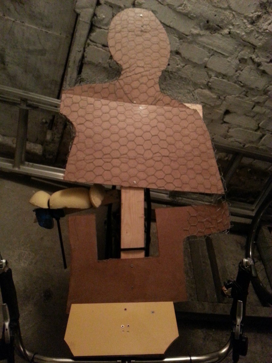 Molempien paikkojen aukon tukkimiseksi sekä aerodynamiikan parantamiseksi laitan niskatuesta Clas Ohlsonilta vaahtomuovia itseni ja kovalevyn väliin. Samalla saan pyörällä istuen kohdistettua pehmusteen paikalleen. Sitten ulkomitat pitävät sinne päin kutinsa, joten voin aloittaa kanaverkon taittelun. Kunhan kuivuu lakka, pääsen niskatuen ja kontaktimuovin hankintareissulle.