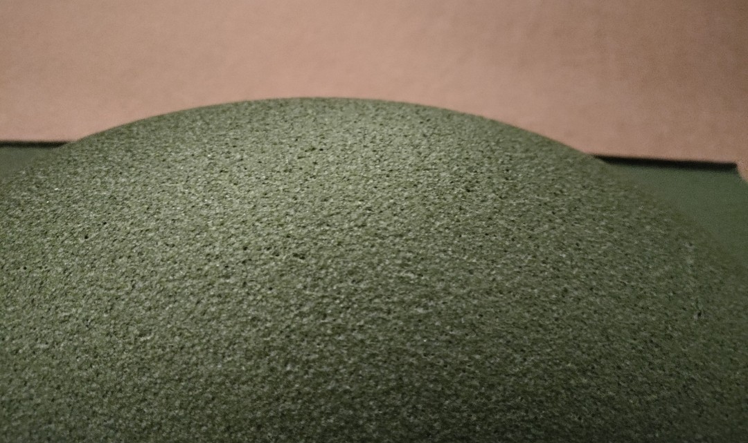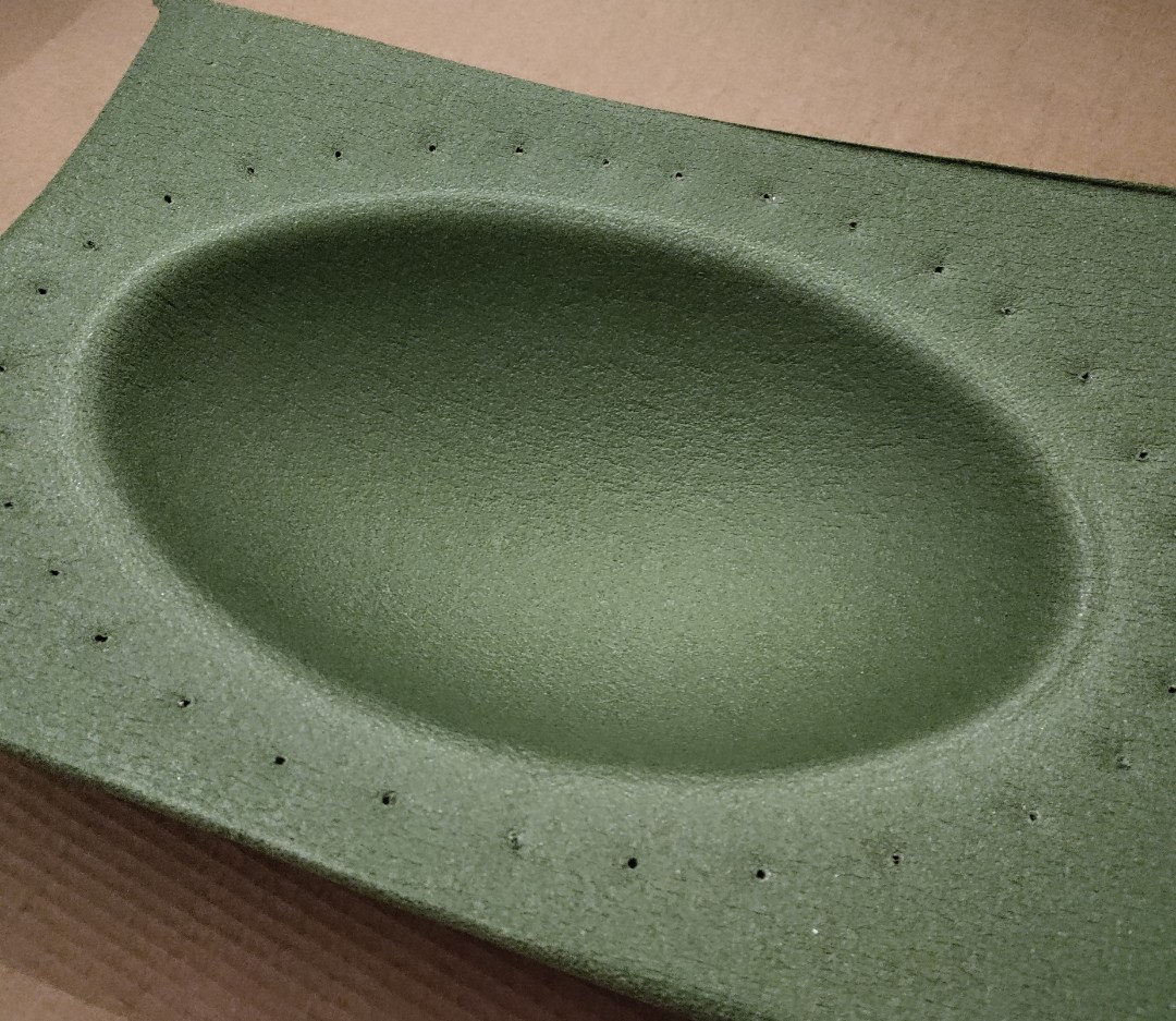 Kokeilin EPE-vaahdon muokkaamista lämmöllä ja ilmanpaineella. Uunissa 90 asteeseen ja paine pyörän pumpulla. Muoto lastulevyssä on ellipsi.
