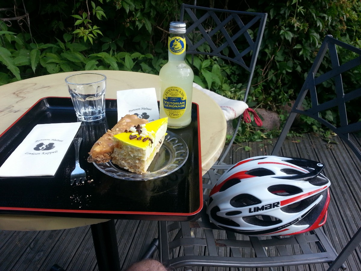 Cafe Helmi sisäpiha Porvoossa. Kinuskipähkinäkakku on tosi makea ja voimakkaan makuinen murustavan kuivia osia tekstuurin vuoksi sisältävä herkku, ja kestää parituksen Fentimanin ärtsyn sitruunan hedelmälihaa sisältävän limun kanssa. Fentiman tekee parhaita blandiksia ja tämä pelittäisi mainiosti siinä roolissa. Mangomoussekakku on superpehmeä ja upea balanssi makeuden ja hedelmäisyyden välillä tekee tästä parhaan tuotteen, jota olen vuosien aikana maistanut täällä. Kärkeä koko maassa ja parempaa olen saanut vain ulkomailla, eikä ero ole suuri. Hatun noston arvoinen tuote.