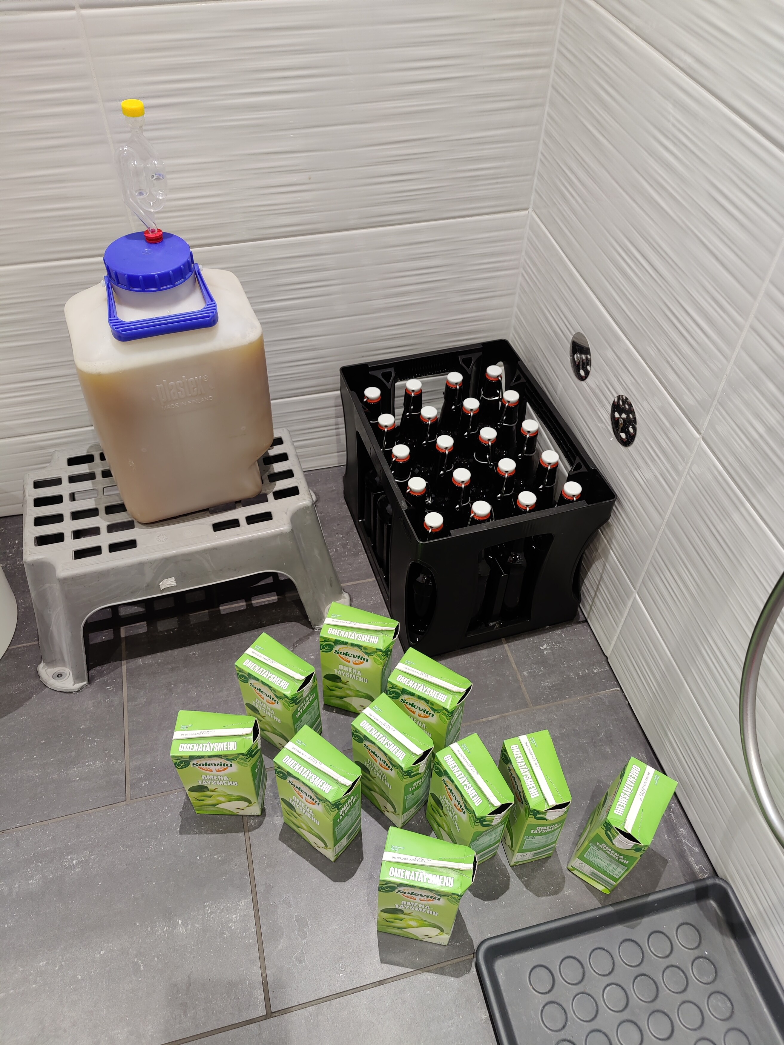 Käymisastiaan jäi hyvä hiivakakku pohjalle. Siispä Lidlistä 10 litraa omenatäysmehua 0,85€/kpl ja siideri tulemaan.