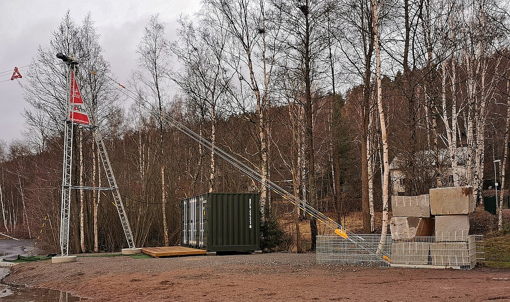 Kävin eilen tarkistamassa, kiristysvaijeri lähtee vastapainosta, menee kannatinvaijerin päässä olevalle pyörälle, painon pyörälle, tolpan pyörälle ja takas painoon missä on talja.