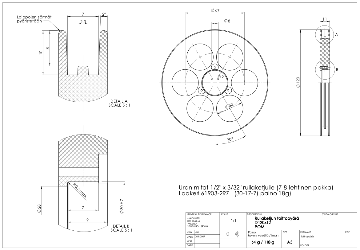 Vetävän ketjun taittopyörän pitää olla niin suuri, ettei painu koloille harjanne. 130 mm on minun taittopyöräni.