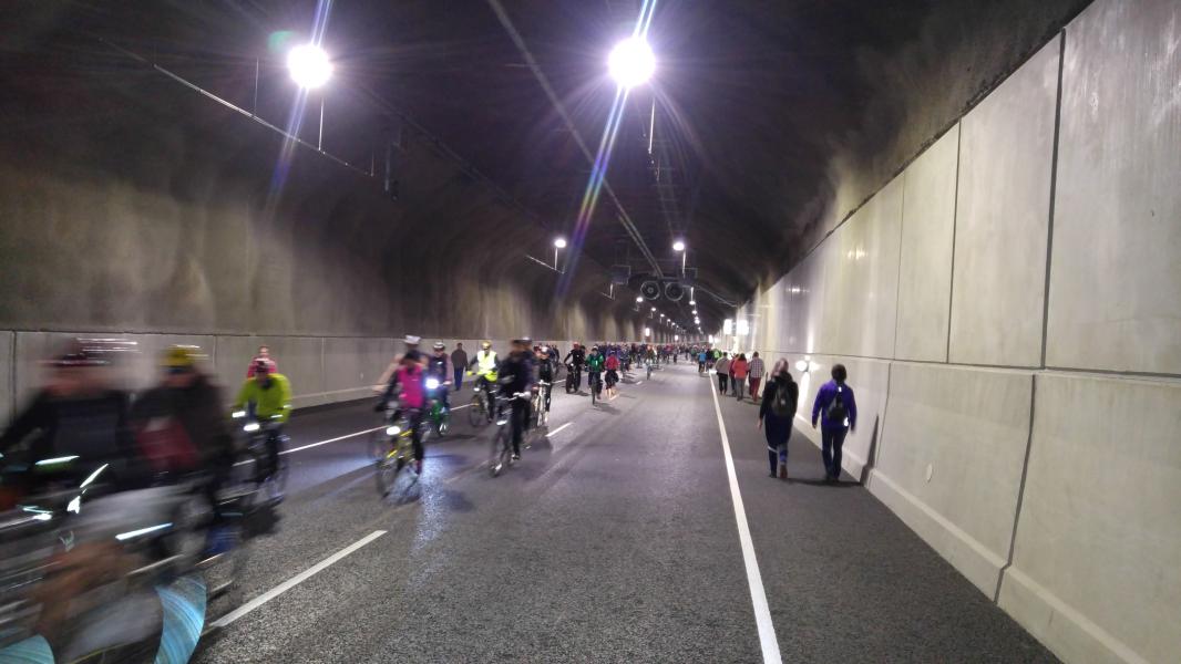Joo, aivan idioottimaisesti järjestetty tapahtuma. Ihan hyvin olisi voitu sallia liikennesääntöjen mukainen ajelu pyörillä pohjoisen puolen tunnelissa, kun kävelijät ruuhkailivan etelän puolen putkessa. Nyt kaikki oli tungettu tuonne etelän tunneliin. Pohjoistunnelissa ajeli vain tilausbussi silloin tällöin ja tapahtuman huoltoliikenne lähinnä parkkeerattuna etelän puolen seinustalle. Hyvin oli tilaa ajella. Minä en tiennyt, ettei sinne saa mennä ja ajoin tunnelin edestakaisin tuolla rauhallisemmalla puolella. Nopea on tuollainen reitti päästä paikasta toiseen. Juuri sopiva kallistus. Rullaamalla kulki pyörä noin 30 km/h ja ylämäkeen sitten sitkuttelin hitaammin. Jälkeen päin kuulin, että muita oli kielletty menemästä sinne. Minulla kävi kai sitten hyvä tuuri, kun ei kukaan huomannut kieltää. ![]()