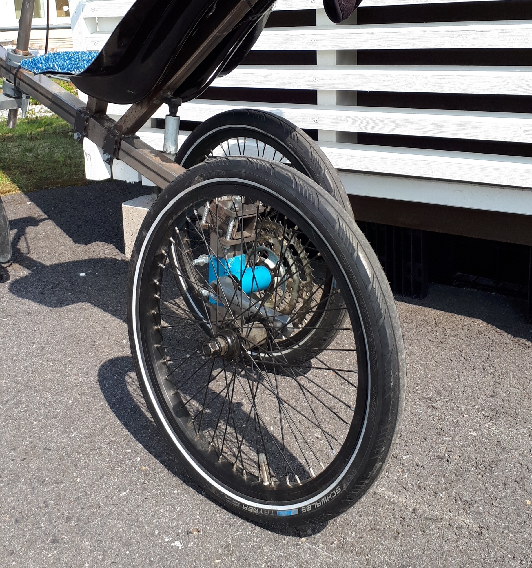 No nyt on kallistuva akseli paikoillaan ja koeajettu. Pelotti liikkeellelähtö aivan perhanasti, (että jos pyörä lähtee kaatumaan oikealle niin ehdinkö saada huonon jalan maahan, ennen kuin poski ottaa maahan) mutta onnistui kuitenkin. Kallistuvasta flevotrikestä tuttu tekniikka, että pitää polkaista lähtöpolkaisu täysiä ja sitten katsotaan kaatuuko vai pysyykö pystyssä. Olihan hieno tunne ajaa kallistuvalla nojapyörällä, vaikka pelottaa joka hetki aivan hirveästi. Pitää treenailla pikkuannoksilla, jospa se jännitys siitä vähitellen hälvenisi. Huonoa kättä en vielä uskaltanut tankoon laittaa.
