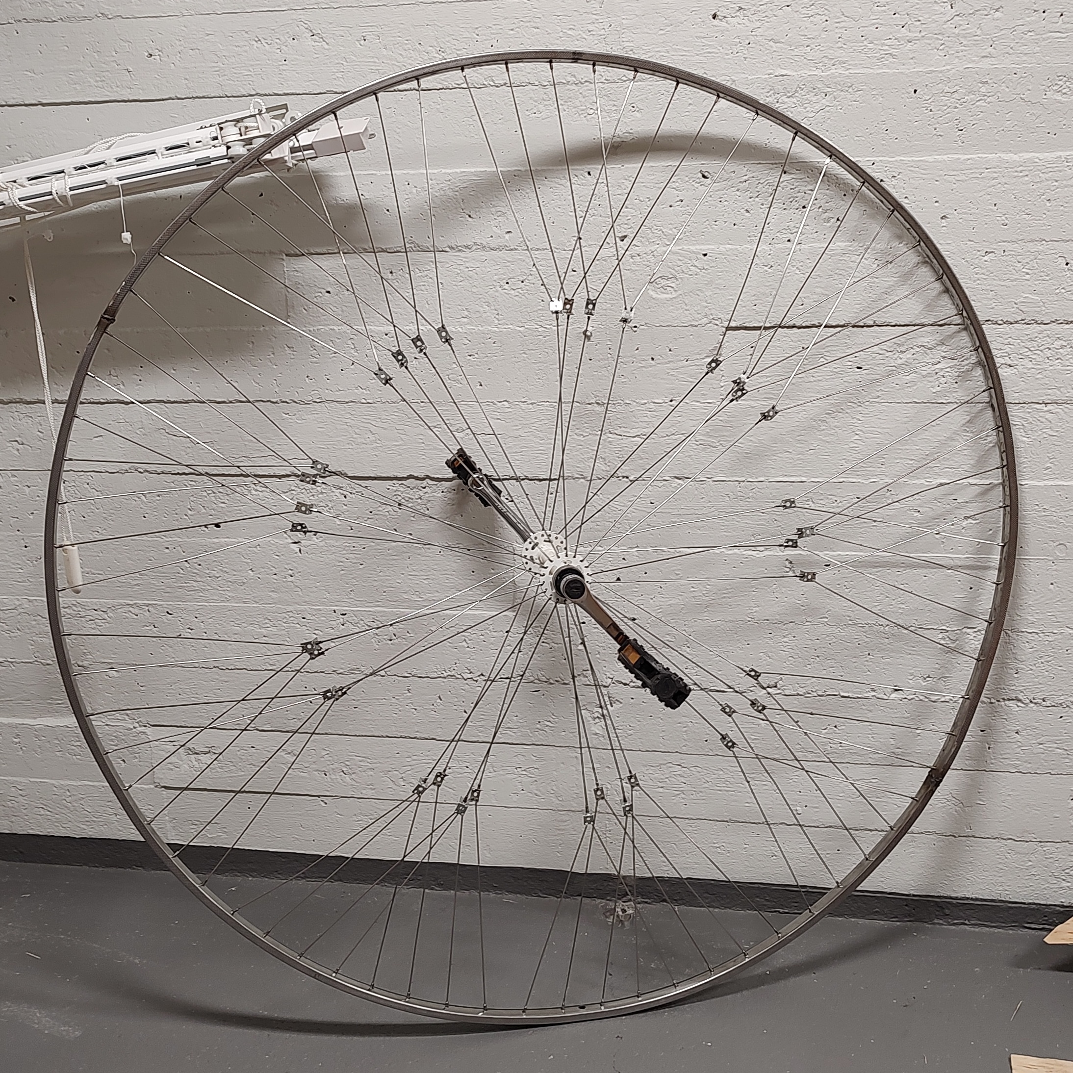 Hyvän mielen projekti nousi vanteilleen. Penny farthing, 50" ja 14" vanteet. Budjetti (25€) triplaantuu pian, jos saan etukiekon rihdattua suoraksi ja jäykäksi ja pääsen tilaamaan renkaan Ruotsista. Etukiekko tehty yksipyöräisen levitetystä navasta ja kahdesta mummiskan vanteesta. Pinnoja 108 kpl, eli 36+72 kpl, välissä patenttivanteen palanen. Rungossa käytetty romulavalta dyykattujen Erkkola -potkulautojen osia.