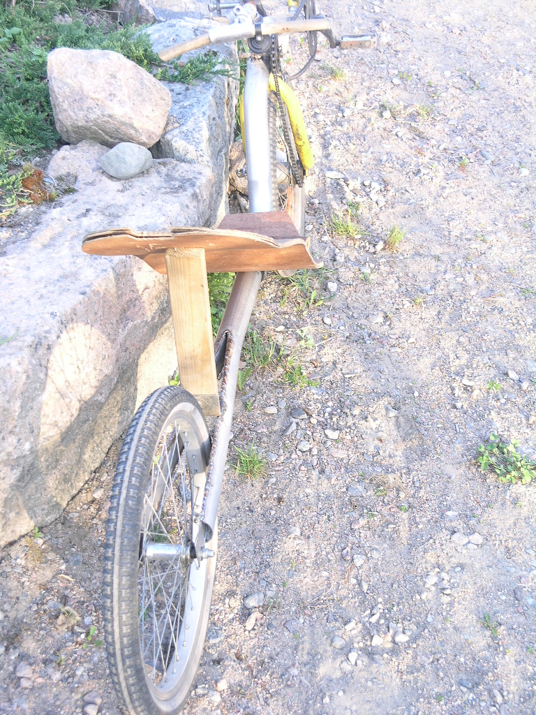 Akseliväli on 1250mm , istumakorkeus 310mm ja poljinkeskiön korkeus 470mm. Akseliväliä vois varmaan lyhentää tuo 20" rengas mahtuis hiukan eteenpäin haarukkaa levittämättä. Osat on lastenpyörän osia , poljinkammet on 150mm eli vähän edellistä versiota lyhyemmät. Eturataskin on pienempi , ehkä tuohon saa toisen liitettyä jotenkin viereen. Testilenkin kävin heittämässä ns, Vuoksenlenkki noin 6 km ja sen verran innoissani olin ett pulahdin lenkin jälkeen Vuoksessa uimassa. Virkistävää kuulemma 8 astetta. Hyvin toimi , tosin penkki ei oo mitenkään kohallaan. Se on ensimmäinen vaneripenkki jonka kokeilin liimata kasaan mutt muoto ei oikeen sattunu kohalleen ja nyt se on vielä asennettu toisin päin kun alunperin oli tarkoitus. Jos tekis vanerista penkin jossa ei olis ristiseläntukea kiinteenä ollenkaan ja laittas siihen sitten irtonaisen ristiseläntuen niin että se vois liukua tarpeenmukaan, toimisko tuo ?