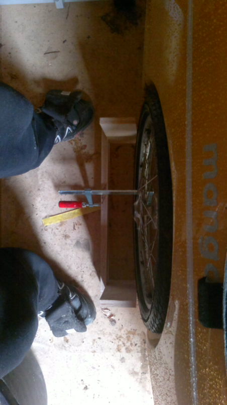 Kutsu pari kaveria avuksi. Pistä toinen istumaan (mieluimmin lähellä omaa painoasi) sisälle ajokkiin. Aseta rima korin keulan ali siten, että ensin läpi lyöty naula on renkaan kulutuspinnan keskikohdalla ja lyö toinen naula vastapuolelle renkaan keskilinjan kohdalle. Pyydä toista kaveria pitämään naulan kärkeä renkaan keskellä ja piirrä renkaisiin merkit naulojen kärkien kohdalle kuulakärkikynällä. Työnnä ajokkia siten eteen päin vajaat puoli etupyörän kierrosta siten, että merkit ovat sellaisella kohdalla, että merkkien väliin asetettu rima on vaaterissa pohjaa vasten ja merkitse toisen naulan kärjen uusi paikka renkaaseen kuulakärkikynällä. Naulan kärki osoittaa etupyörän takaa mitattuna eri paikkaan kuin etupuolelta. Oikea paikka, tai siis takaa mitatun merkin sijainti olisi siis millistä kolmeen milliin edestä mitatun merkin sisäpuolella.