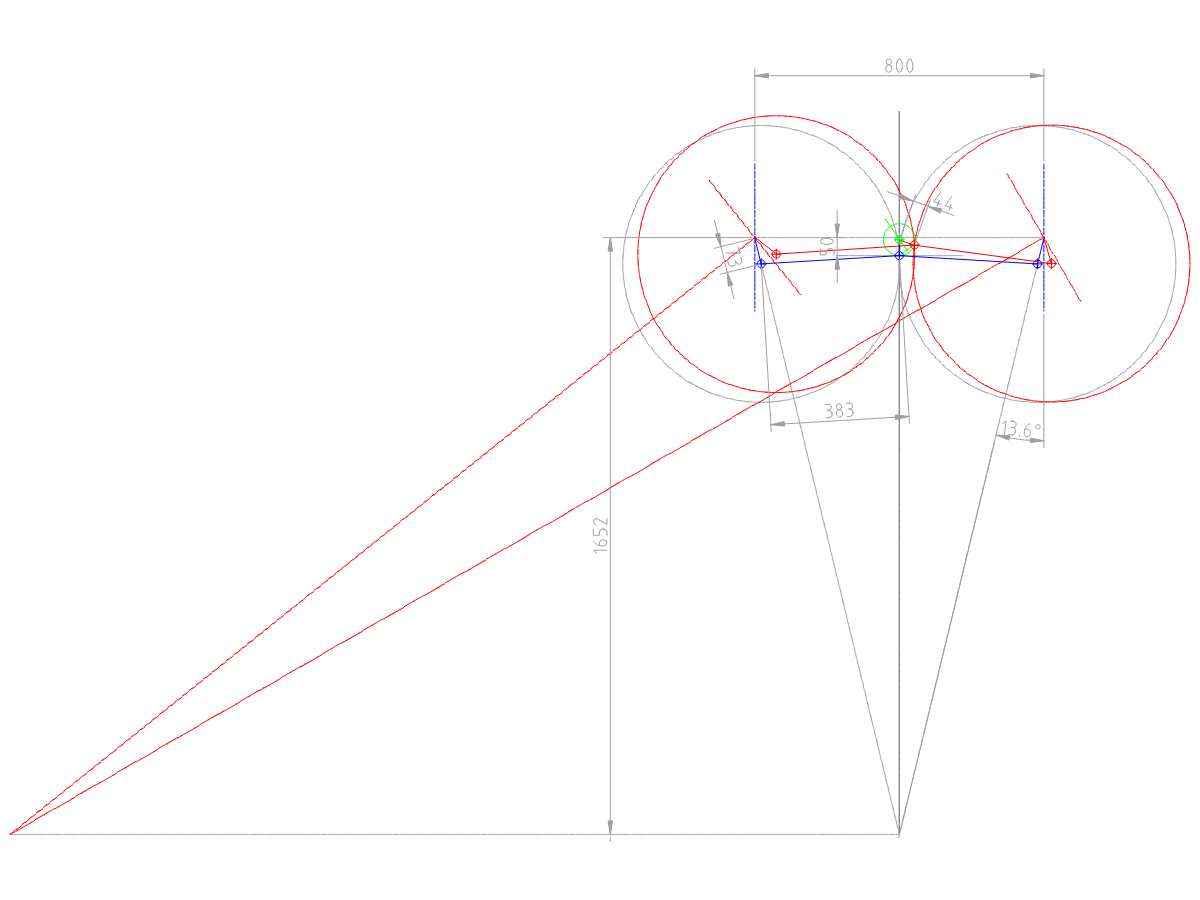 vph kirjoitti:Harrastin nyt iltasella tasogeometriaa viivoilla ja ympyröillä ja selvitin ohjausvipujen ja -tankojen pituudet piiruspöydällä. Mielestäni viisaampi tapa kuin "normiarvonta" eli ackermanin arpominen useita reikiä poraamalla. Laitan kuvan tähän, en tiedä jaksaako siitä seuraamaan piirtämisen logiikkaa, mutta "ratkaisu" tuossa on tuo 44 mm keskitangon pituus. Ohjauksen paikka (50 mm) ja sivuvipujen pituus (73 mm) oli ensin päätetty visuaalisesti sopiviksi. Käsittääkseni tuossa tulisi ohjauksen mekaanista tehostusta noin 1.66 x.