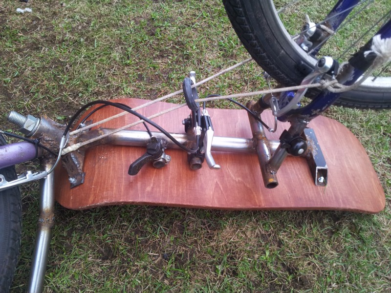Laittelin toisen jarrun, holkin ohjauslaakereiden väliin ja heijastimet sekä kilikellon. Nyt on katulaillinen. Samalla otin mahan alusesta kuvan, niin näkee miten vaihde- ja jarruvivut on laitettu. Jarruvivut on sen takia noin ylhäällä että peukalot menee heittämällä penkin yläpuolelle puristamaan vastaan. Alempana olisi muuten mukavampi. Jousituksen naruja kokeilin ajaessa. Ne sai puristettua kahdella sormella toisiinsa kiinni. Ei tarvi kovin voimakasta jousta.