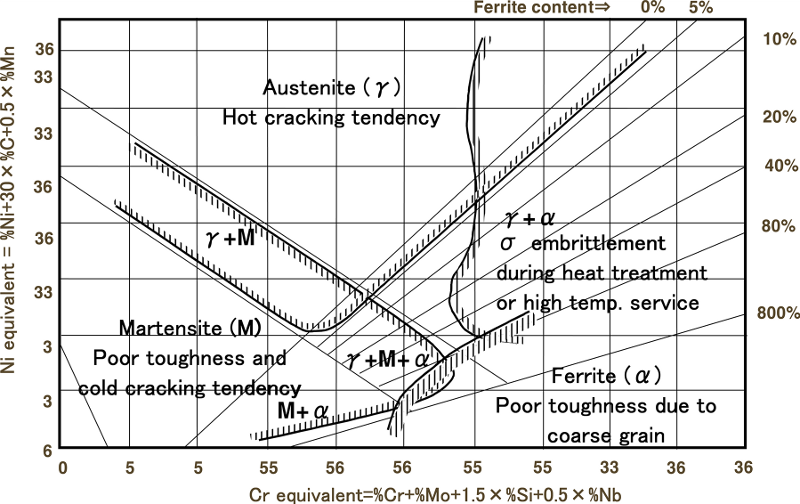 Koska hitsiin sekoittuu lisäainelangasta erityyppistä terässeosta, hitsin mikrorakenne muuttuu hauraaksi. Tässä Shaefflerin kuvaajassa esitetään millaiseksi hitsin mikrorakenne muuttuu. Mustan raudan hitsilisäaine sijoittuu tuossa kuvaajassa teräksen lisäainemääristä lasketun kromi- ja nikkeliekvivalenttien suhteen vasemmalle alas. Tyypillinen ruostumaton teräs oikealle ylemmäs. Kun hitsissä nämä sekoittuvat, seostunut kohta joutuu halkeamaherkälle alueelle.