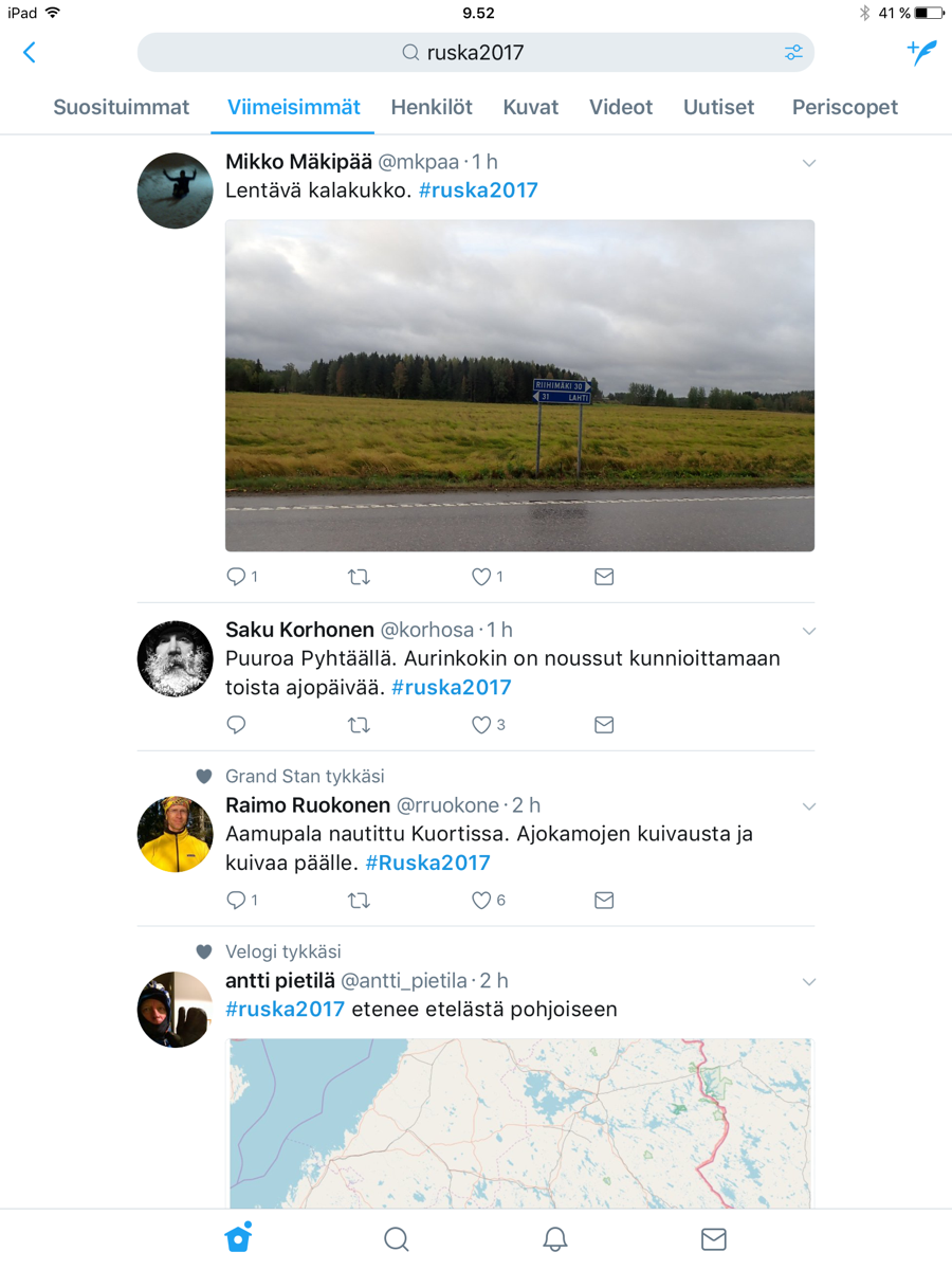 Tuonne Twitteriin näkyy tulevan myös aika paljon kuvia ja raporttia matkan varrelta: https://twitter.com/hashtag/ruska2017?src=hashtag_click