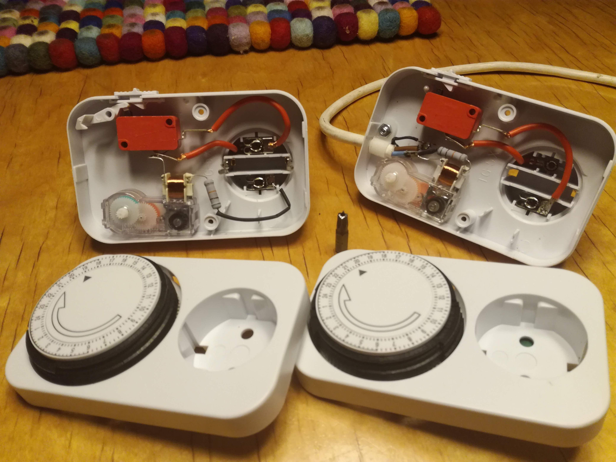 Tuollaisessa mekaanisessa ajastimessa on tavallinen mikrokytkin, jota käytetään kellomoottorin pyörittämällä kiekolla, johon nostetaan nystyröitä asettamalla kytkentäliuskat ajastusasentoon. Erotin kellolaitteen moottorin omaksi piirikseen ja vedin sille roikkajohdon viereisestä töpselistä. Samalla irrotin pistotulpan tapeista sinne menevät kytkennät. Tästä kuvasta näkynee, mitä tein.