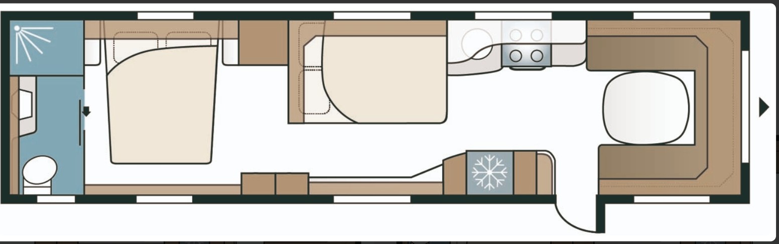 Tuossa esimerkiksi 22m2 asuntovaunun pohjapiirros. Saman kokoiseen kerrostaloasuntoon ei mahdu kahta parisänkyä ja 4-6 hengen ruokailuryhmää.