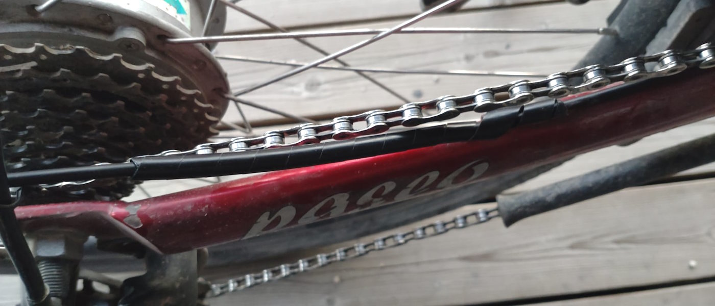 Pyörä ehjätty. Kuori ja vaijeri vaihdettu. Kuorelle lisäsuojausta spiraalilla.