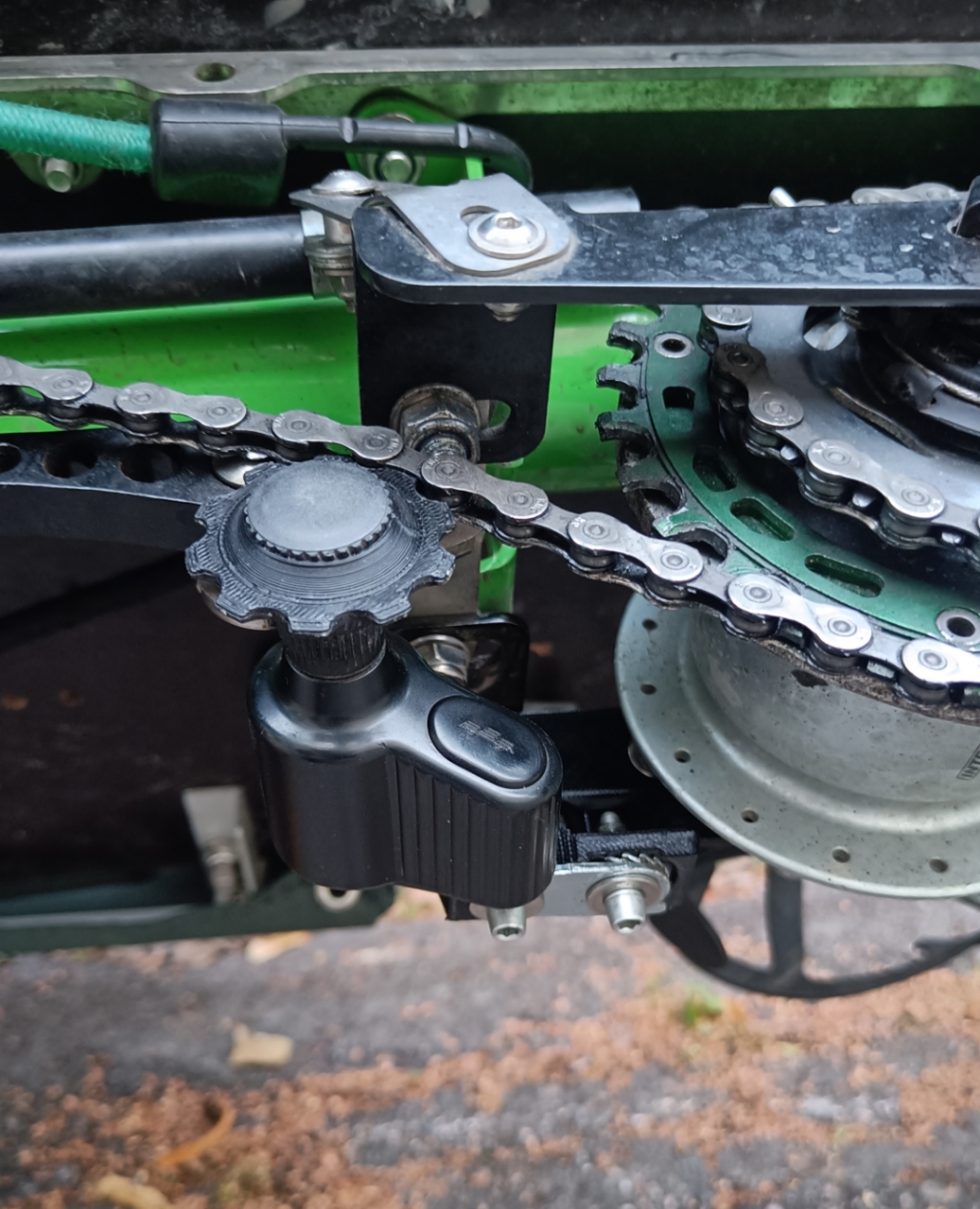 Jos tuo osoittautuu liian vaikeaksi saada toimimaan niin vaihtoehtona mietin napadynamon käyttöä ketjunkiristimenä jolloin saisi virtaa siitä. Pullodynamossa on jousi joka pitää sen ketjua vasten aika hyvin. Rissan kylkiä voisi muuttaa niin että siinä on ketjua pitävät laidat jos se on tarpeellista