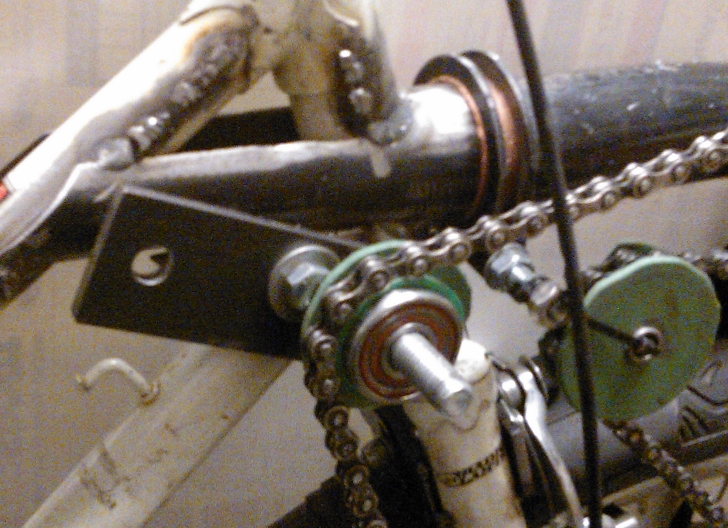 Paasaisin vielä tässäkin yhteydessä vetävän puolen ketjun taittopyörän koon merkityksestä. Isompi taittopyörä, joka tietenkin täytyy laakeroida emäputken etupuolelle, jottei ketjulinja alas rattaille mene pois ohjausakselin linjasta, pitää vähemmän ääntä ja säästää polkemistehoa pienemmän häviötehonsa takia. Kyllä tuolla pienelläkin silti ajamaan pääsee. PWkin on ajellut tuhansia kilometrejä melko pienellä vetävän ketjun taittopyörällä. -Pirunmoista vauhtia kaiken lisäksi.