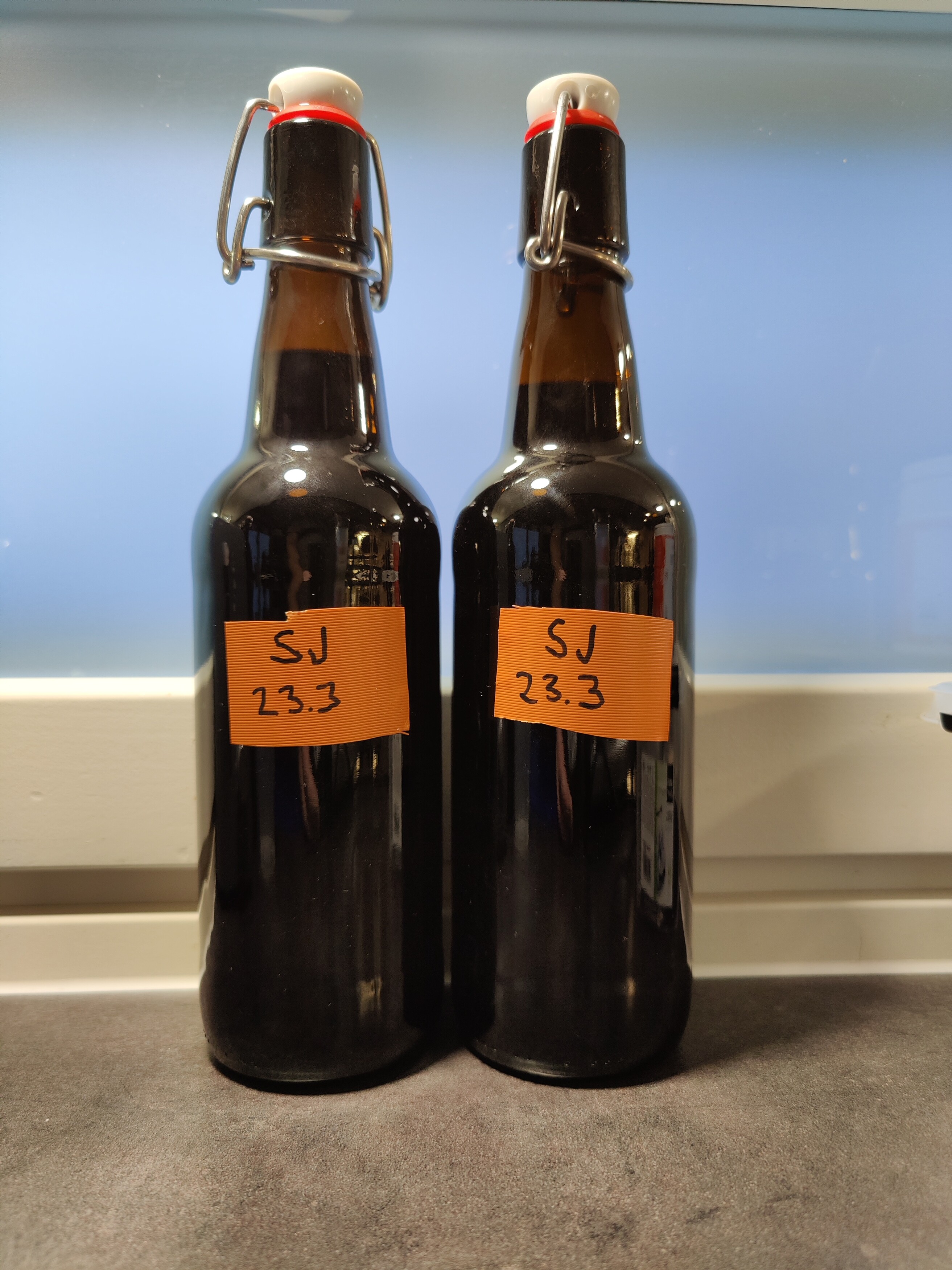 Puolet sahtijuoma-erästä sai käydä huoneenlämmössä loppuun. Pullotin sen jälkikäyntisokerin kanssa. Piti alkaa etikettejä tekemään, kun on jo puolikymmentä eri juomaa pulloissa. Enää ei pysy muuten kärryillä mitä mikäkin pullo sisältää. ![]()