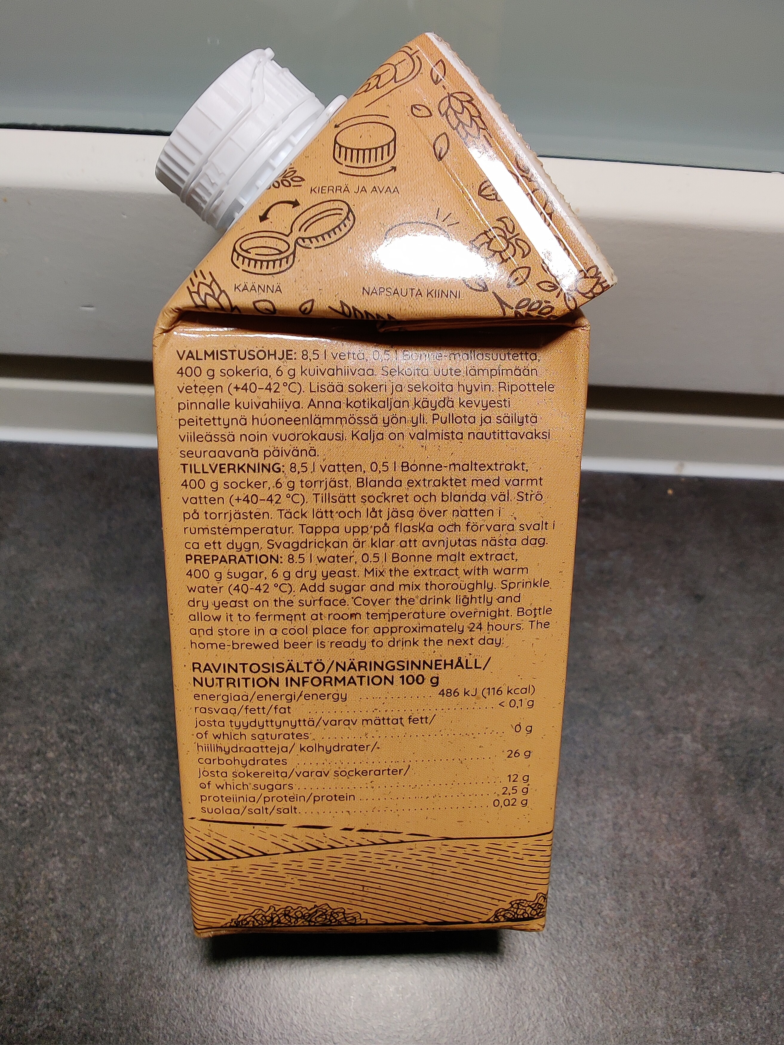 Vilijami kirjoitti:Tuli Bonnen uutteesta oikein hyvä ja raikas kotikalja. Maku vaan paranee useamman päivän jääkaappisäilytyksessä.