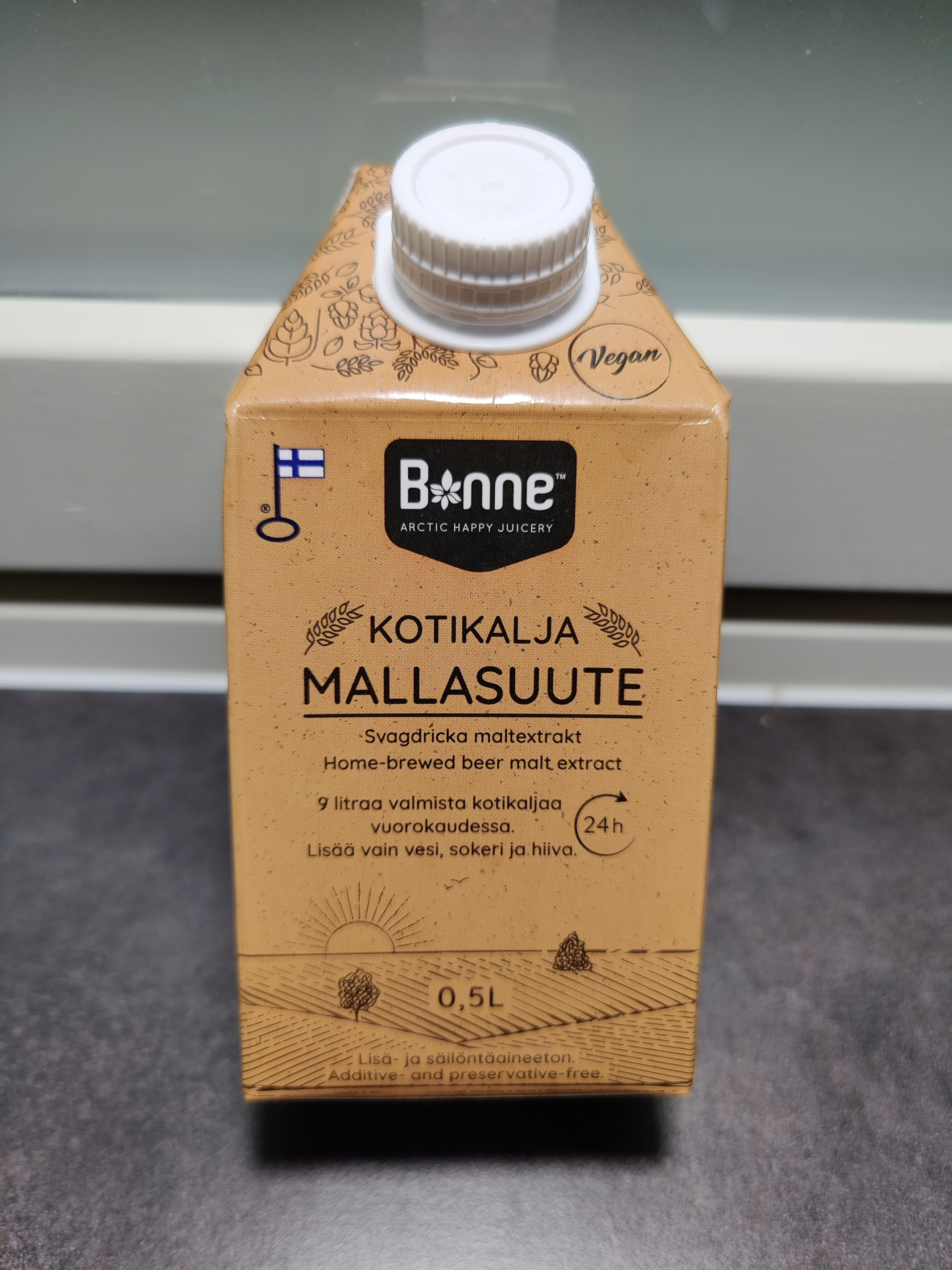 Osuuskauppaan oli tullut uutuutena Bonnen kotikaljauutetta puolenlitran tonkka. Pitihän sitä ostaa, kun on säilöntä- ja lisäaineeton sekä vielä Vegan tuote ![]()