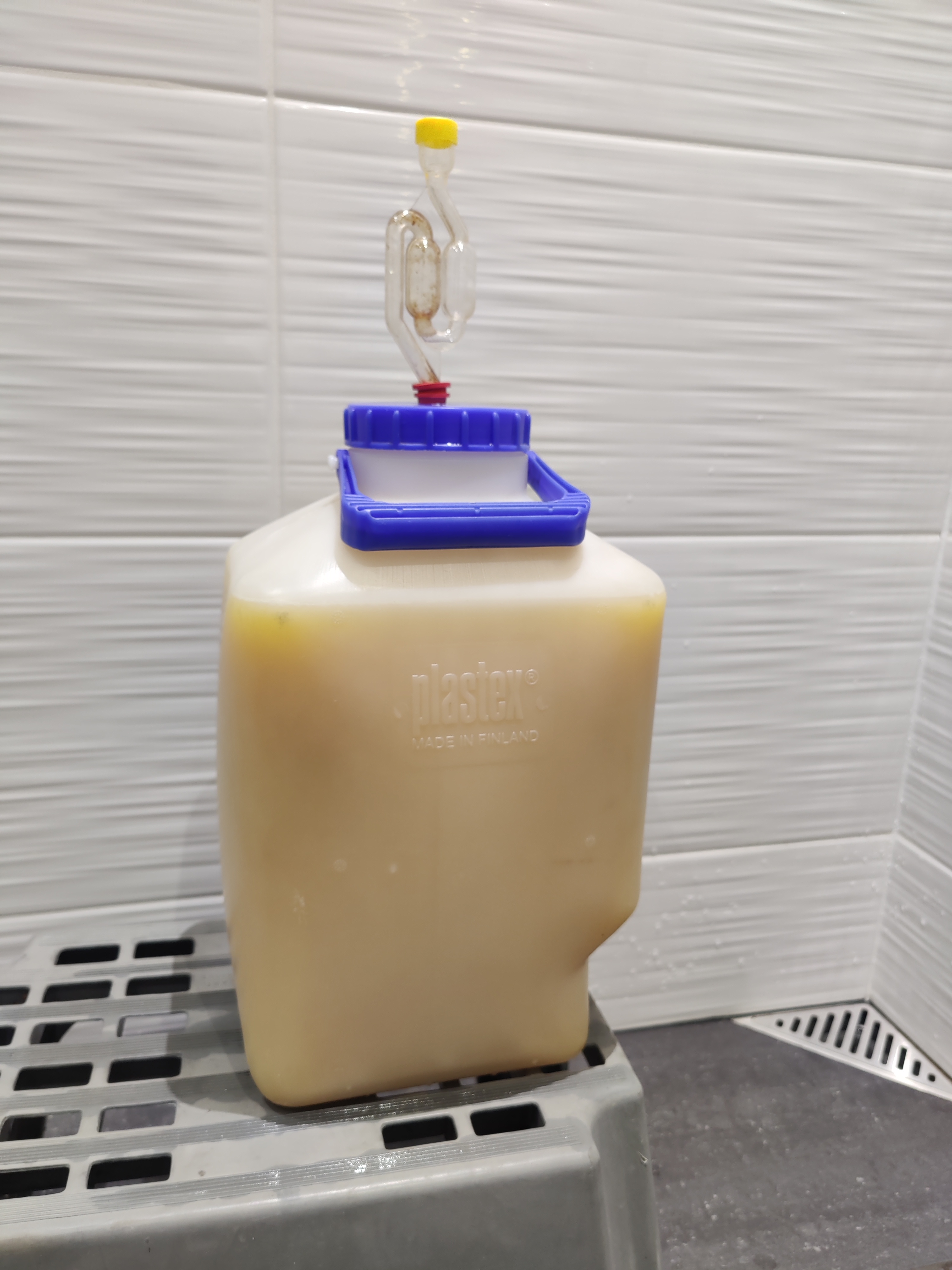 Ihan ohjeen mukaan sokeri, mutta juoma alusta loppuun 10 litran hanallisessa plastexin astiassa. Veden keitin isossa kattilassa ja annoin jäähtyä yön yli. Silloin pääsee käymisenhidastaja kloorista eroon. Hiivastartterin tein myös edellisenä iltanana, kotipanimomestarimme määräysten mukaan. Silloin koko nestemäärää ei tarvi lämmittää käynnistykseen, vaan huoneenlämpö riittää.