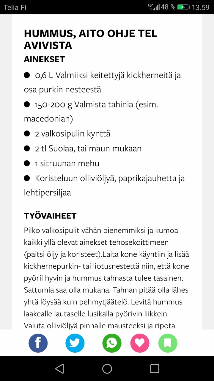 Hummusta oon myös tehny muutaman kerran, perinteisesti se tehdään kikherneistä ja seesaminsiementahnasta eli tahinista.