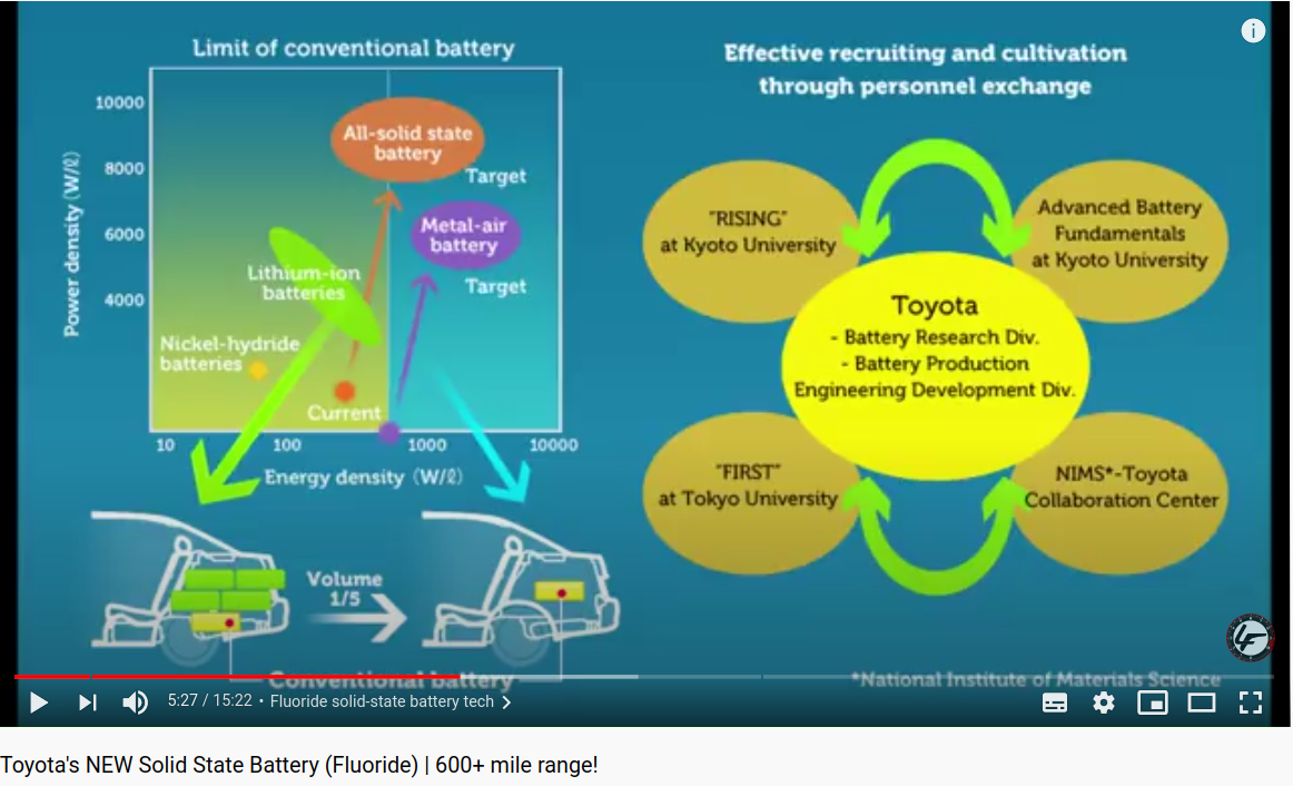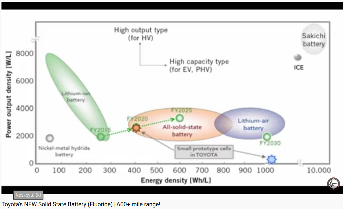 Toyota tekee "salaa" menestyksellistä akkukehitystä, muttei siitä huutele, kuten muut. Aloittivat Priuksella ja tietävät, ettei 10 miljoonaa autoa vuosittain tuottavaa systeemiä kannata muuttaaa keskeneräisen teknologian varassa. Tässä video Toyotan kiinteän elektrolyytin akkuteknologiaan, joka lisää turvallisuutta ja pienentää akun tilavuuden viidesosaan.