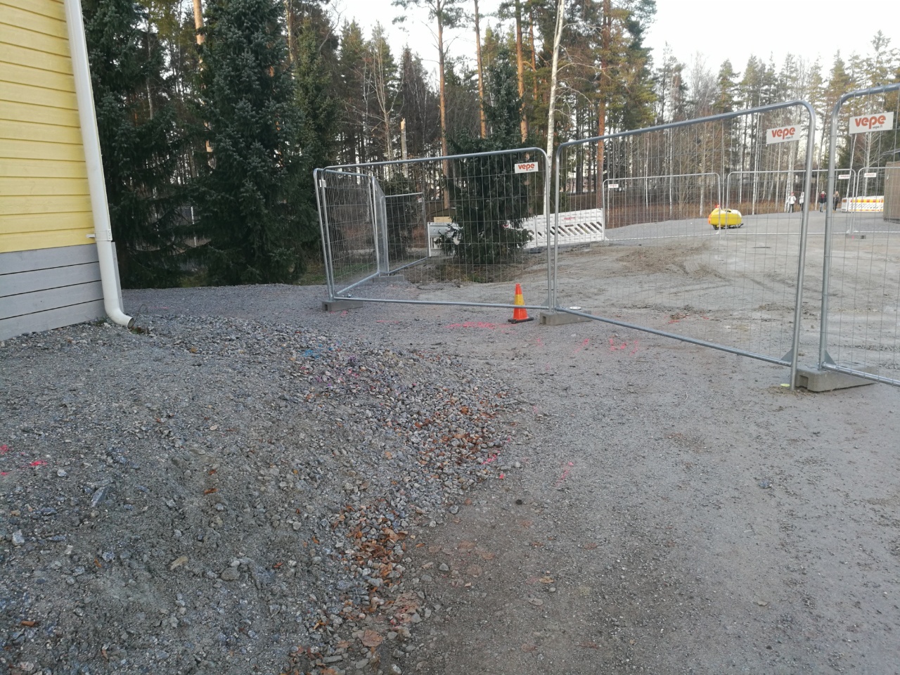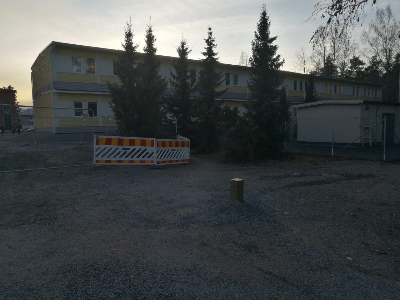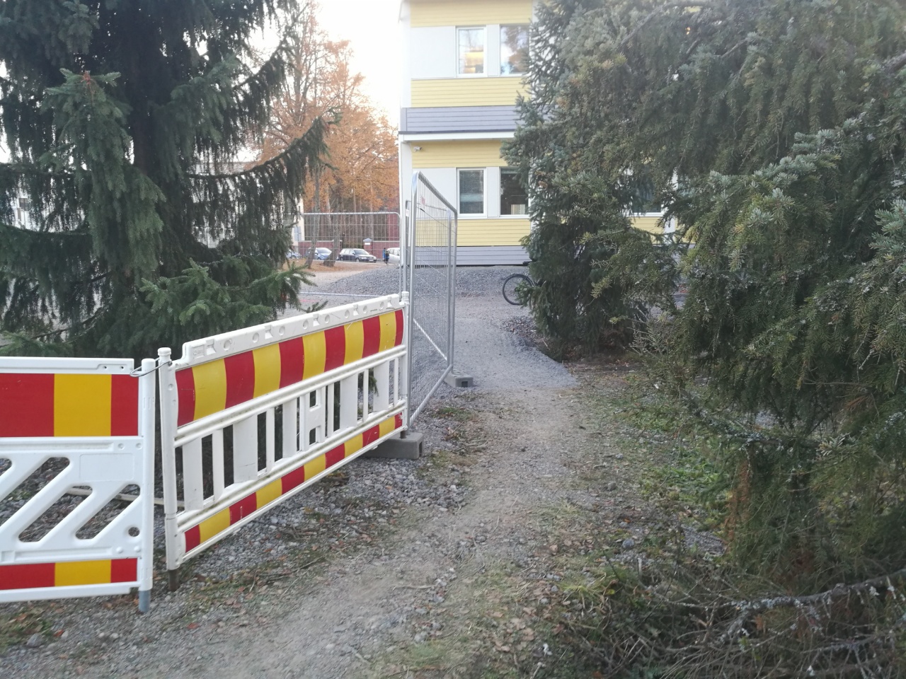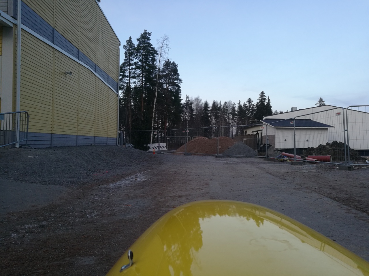 Koskenkoulun työmaan ohi menevä väylä katkastu, ei minkäänlaisia ohjeita tai viittoja. Kyllähän sieltä pieni polku sitten meni, nurkan takaa, kuusten välistä, kinnerin pohja otti kiinni, potkimalla pääsin yli. Ala-arvonen suoritus, pitääkö miun taas valittaa,ei aina jaksais :(