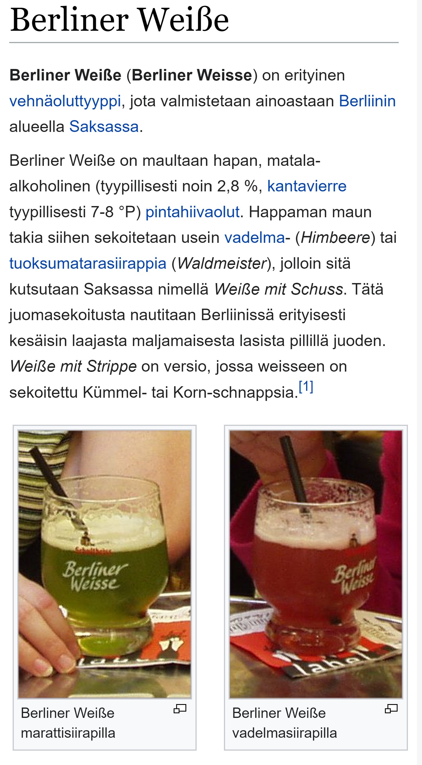 Kotimaasta saatavilla olevat Berliner Weisset ovat aina maustettu jollain tuttifruttikarkilla tai koimyrkyllä. Miksi? Maustamatonta en ole löytänyt.