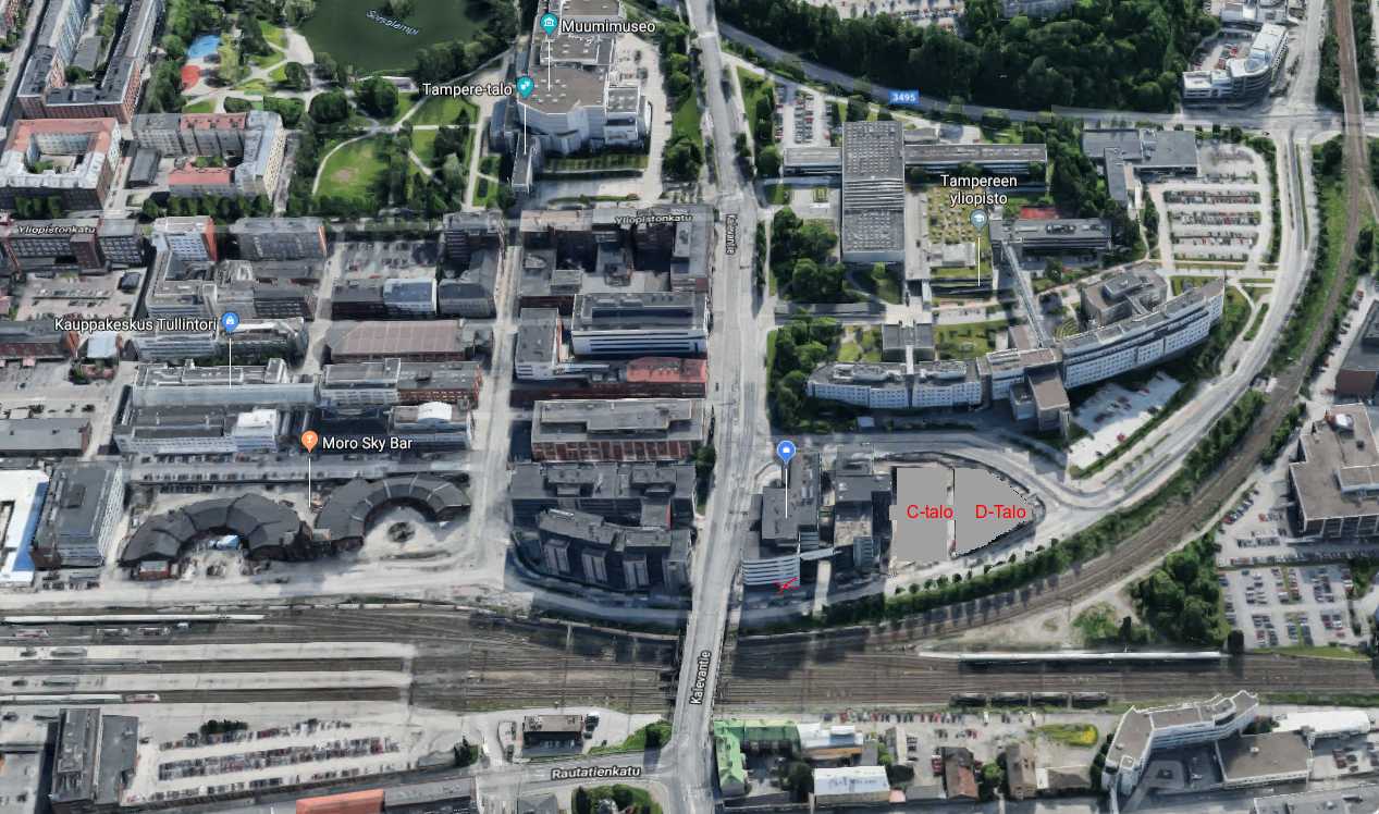 Google Maps ei tunne Technopoliksen C- ja D-taloja, ja siksi vähän vaikea hahmottaa. Täydensin kuvaa että missä kohdin nämä talot ovat ja punaisella raksilla merkitty pyörävaraston sijainti. Tulen päästämään lukkojen taakse, jos sinne haluaa pyöränsä.