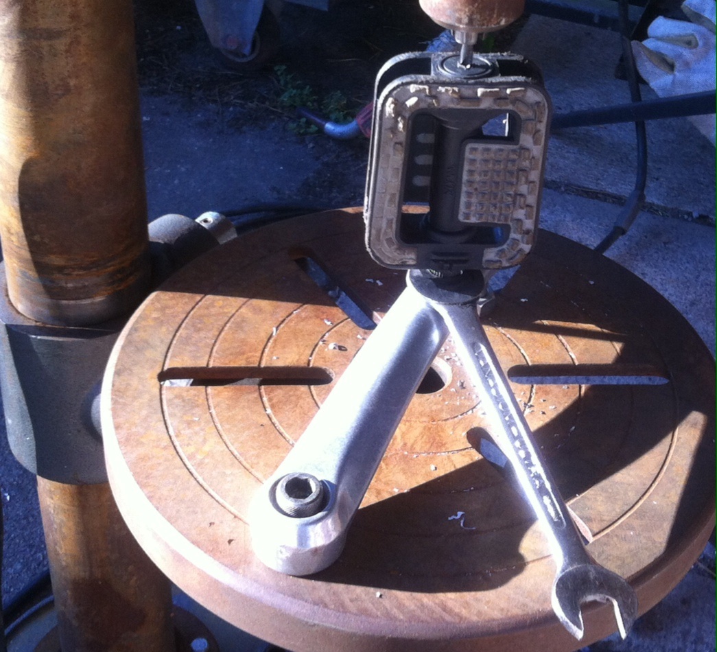 Vähän tutkiskelin noita kampia eksteks ja totesin valun olevan yllättävän mittatarkkaa. Niimpä päätin jättää hommasta työläimmän vaiheen, eli koneistusaikaisen suoruuden varmistavan keskiötapin tekemisen väliin, vaan arvelin koettaa kuinka käy jos vaan kylmästi puristaa kammen päin pöytää. Tietysti piti lisäksi vielä tuki laittaa toiseen päähän jäykkäriks.