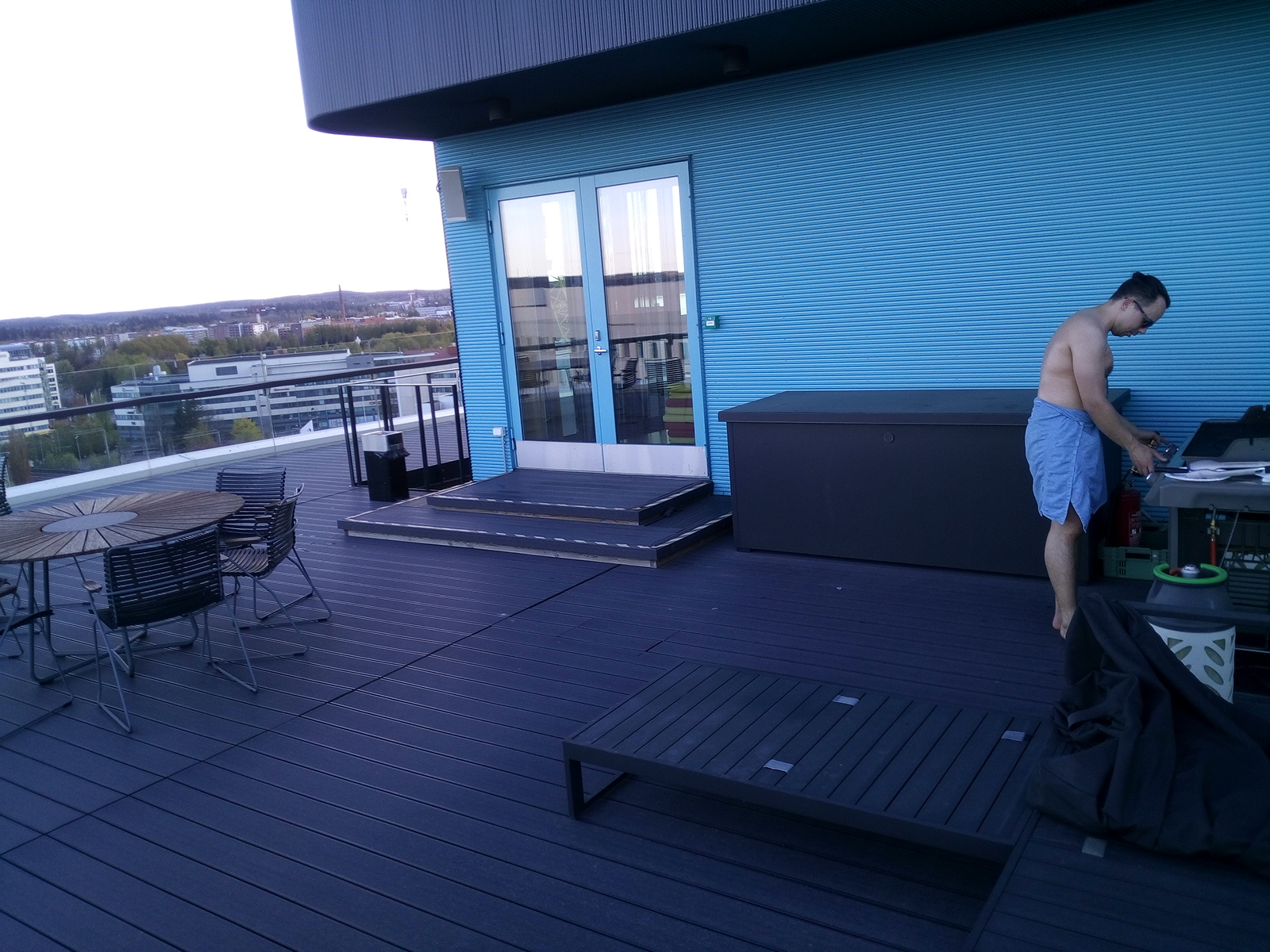 Täällä ollaan terassilla ensiluokkainen olut edessä, mutta vielä ainoana nojapyöräilijänä. Matti Karvonen (Perhepyörä) meni puolen tunnin lenkille kolme varttia sitten. Kävelee nyt tuolta saunaa kohti. Myös Reippailija on tulossa, mutta myöhästyy puoli tuntia. Ihan kunnon kokoontuminen siis saatiin aikaan, vaikka hitu myöhässä. Olosuhteet on täydelliset. Saunassa vain 90 ja järvessä jopa 17.