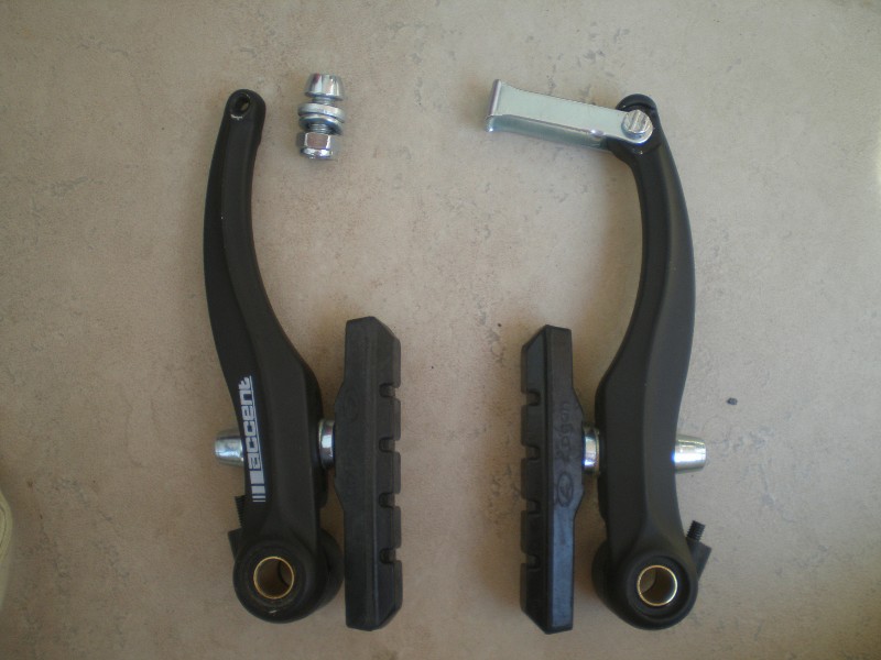 Käänsin myös ton eteen tulevan V-jarrun. Hierasin viilalla ton metallikillukkeen vanhan tapin veks ja ostin koloon tismalleen sopivan naulan ja kiinnitin vaijenrin kiinnityspultin reikään. Riitti kun katkas naulan pihdeillä ja pajautti vasaralla pään vähän lyttyyn. Vaijerin kiinnityspulttiin ostin sopivan mutterin ja toisen prikan. Tarkoitus pujottaa vaijeri tosta reijästä lenkiksi ja pultilla kiinni.