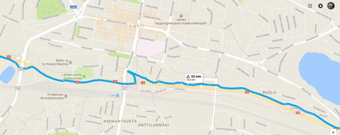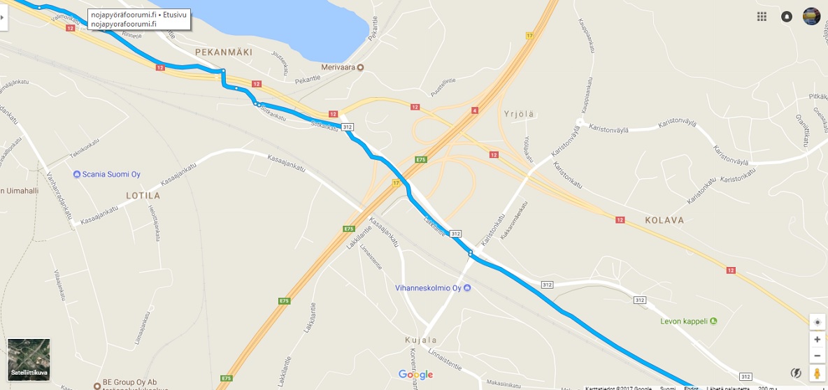 Helpompaa tosin tuntuu kotikoneella isolla ruudulla katsella... Maastokartat sovellusta kännykässä olen kans joskus käyttänyt tämmöiseen suunnistamiseen. Semmonen hauska juttu on jos Google mapsissa laittaa ukon taivaltamaan pyörän sijaan, reitti piirtyy kulkemaan valtatienvartta mutta pyöräilijän viiva menee suht viksusti kevyenliikenteenväyliä.