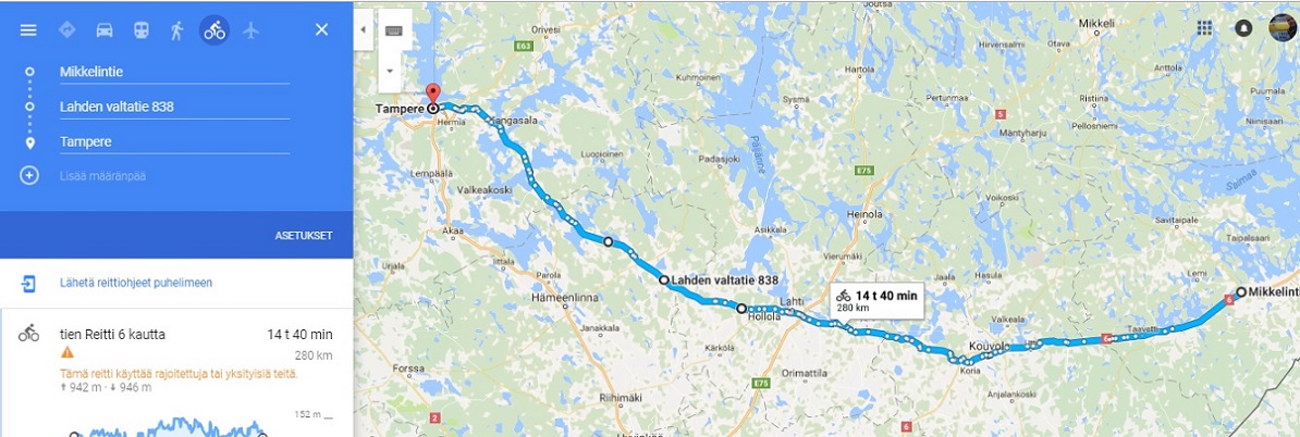 Jos nyt kuvittelee, että siirtyy Tampereelta Lappeenrantaan ja jos ei halua seikkailla Lahdessa eikä Kouvolassa niin 10 km pidemmällä reitillä saa ajaa maaseututeitä.