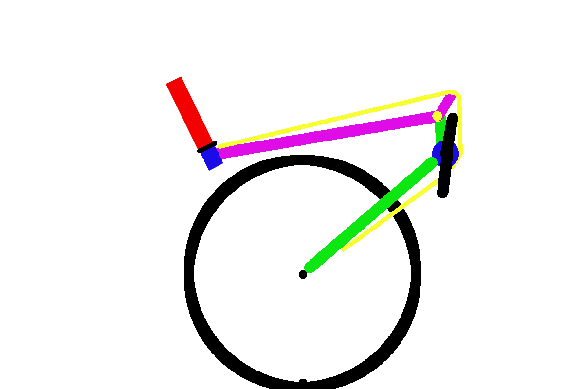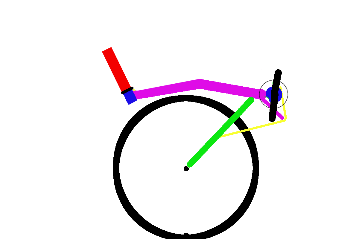 Tuon violetin runko-osan pitää olla paksumpaa, vähintään 35-40 mm putkea, jolloin sen kiinnittäminen lienee helpompaa yläpuolelle tai haarukkaan, kuten tässä lähettämässäni kuvassa. Kampikeskiön laittaminen liikkumaan joustohaarukan mukana rasittaa niveltä ehkä liikaa ja joustoliike tuntuu jaloissa. Hauska tuo sinun keltaisen pallon ja narumutkan välinen lumpiovipu.