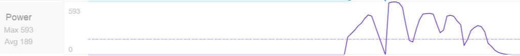 200 metrin ovaaliajo meinasi olla ihan kokonaan liian jännittävää ja samalla hirvittävän hienoa hommaa. Oli elämäni ensimmäinen kerta moisessa karusellissa. Ohjauksen, ajolinjan pitämisen ja apinanraivopolkemisen yhdistäminen kallellaan olevassa ovaalissa oli kokolailla liian haastavaa itselleni. Lopputuloksena on tehomittarin todistamana melkoisen onnetonta pumppausta, kun ei vaan hermo pitänyt mutkissa lisävauhdin vetämiseen, tuossa graafissa vajaa 5 kierrosta, yksi kierros kesti noin 16 sekuntia: