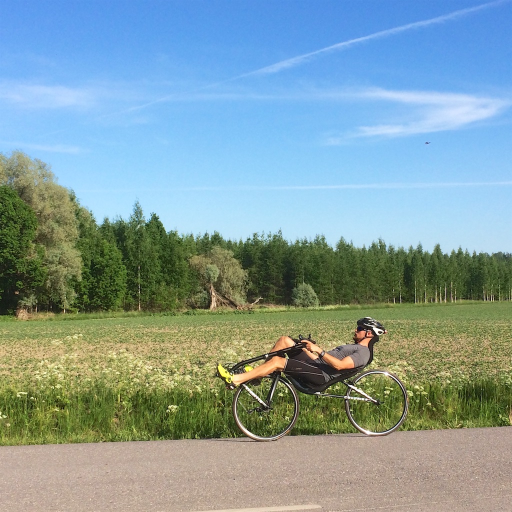 Pienen juomatauon jälkeen en malttanut olla lähtemättä uudelleen ajamaan. Laitoin oikein ajokamat päälle, lukkokengätkin. Kävin ajamassa Bodomin lenkin, 28km. Mukavaa oli. Hartiat ja niskakin jo vähän rentoutuivat. Kylläpä tuntuu mukavalle kun on kaksi isoa kiekkoa alla. Penkki on kapea, mutta sopivan muotoinen. Niskatuki oikein hyvä, vaikka onkin ihan kummallisen näköinen. Hiljainen voimansiirto :!: Vauhtiin ei vielä voi ottaa kantaa kun on rentous vielä kovin kaukana menosta. Mäennousukyvystä sain vähän esimakua. Hitaammilla kampikierroksilla kokeilin sitä että vedin käsillä vastaan ohjaustangosta, kylläpä auttaa :!: Nopeammilla kadensseilla loivemmissa mäissä ei vielä aivot kyenneet siihen että olisi käsilläkin rytmi säilynyt.
