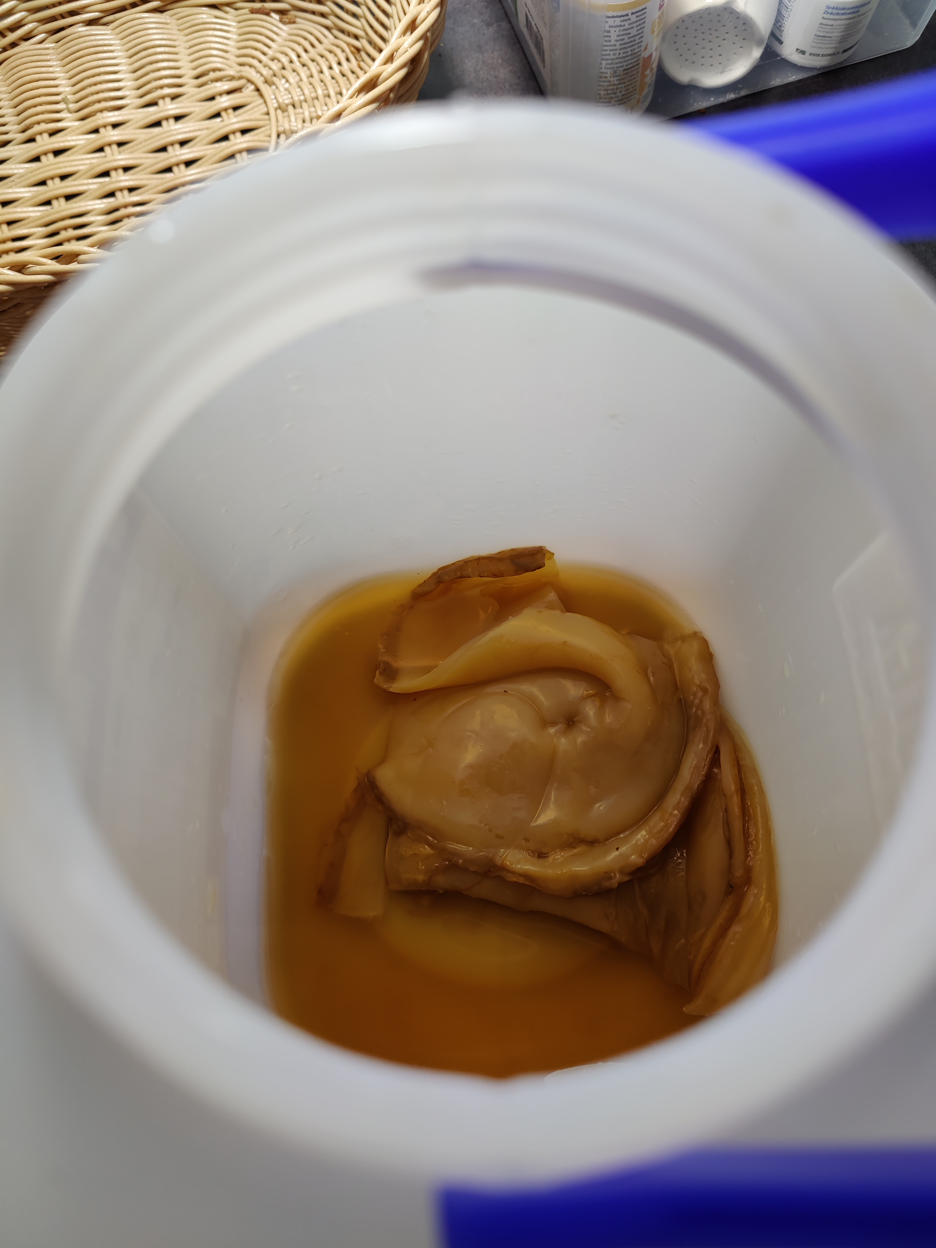 Yöllä mietin kuohahtaako tuo 2 litran astia tyhjäksi, kun sokeria on niin tuntuvasti, mutta ei. Mitään ei ollut tapahtunut vuorokaudessa. Miksi? a) oliko vierre niin sokerista että hiiva tukehtui? Vai b) oliko pinnasta otettu erä jo niin hiivatonta?
