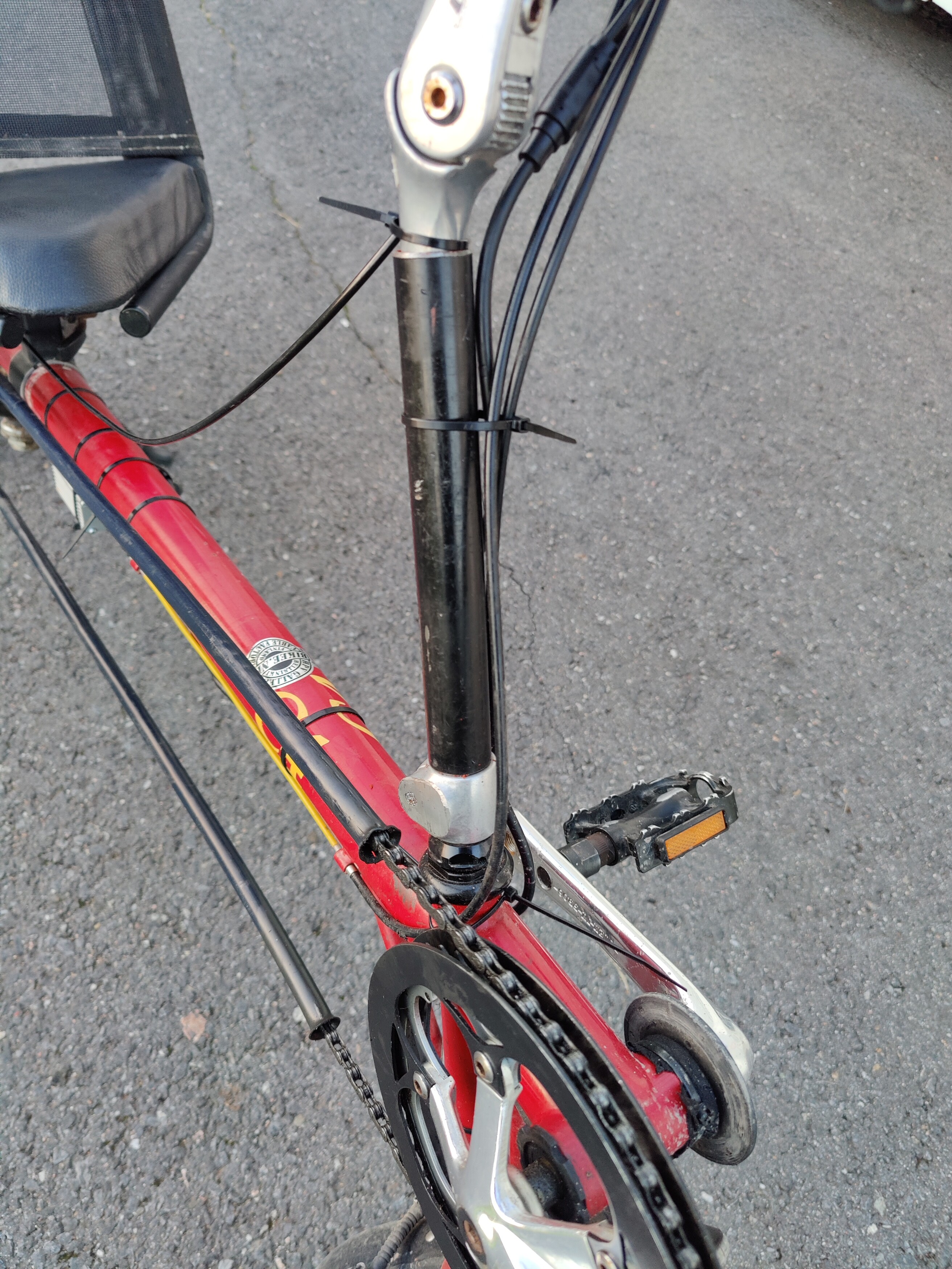 ...Jostain romupyörästä purettu ulompi satulaputki (mikä sen nimi on?) sopi juuri ja juuri nihkeästi tuumaisen putken päälle.,,