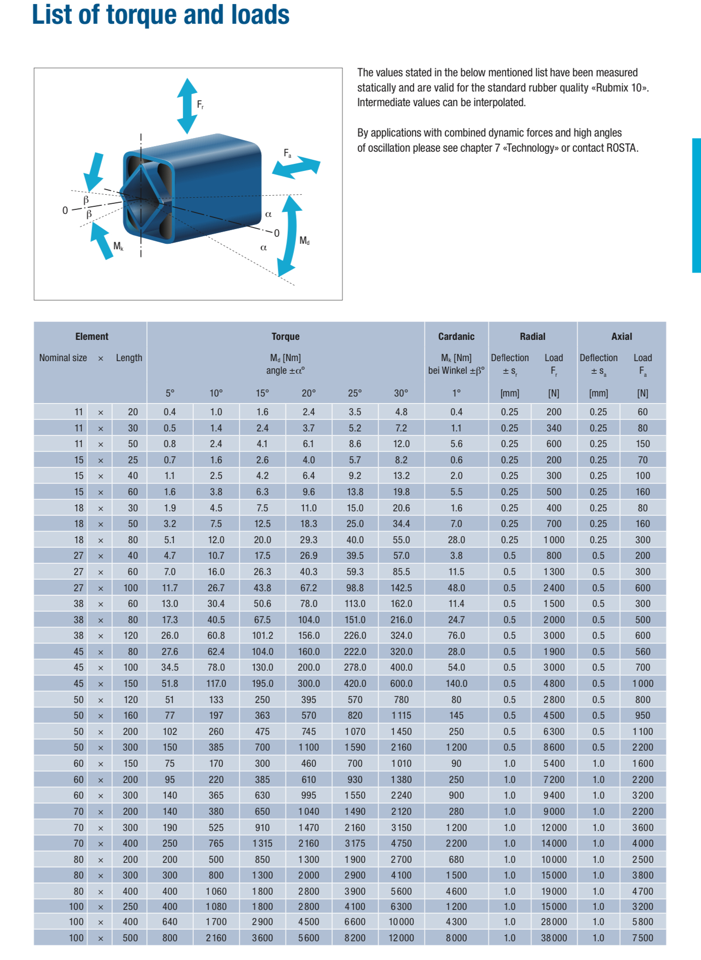 Tuollainen 45x45x100mm palikka tuottaisi suunnilleen halutun 74Nm 10° kiertymällä. Siltä osin taulukko vastaa omia tuloksiani, että 30° kiertymä vaatii noin viisinkertaisen momentin 10 asteeseen verrattuna. Vain absoluuttiset arvot eroavat. Tarvittaviin momentteihin voisi siis päästä, jos vielä paksumpaa kumia saisi paikalleen. Elementin pituutta voisi myös hyvin kasvattaa ainakin 200 milliin, mikä olisi hyvä vastustamaan muihin suuntiin vääntäviä voimia.