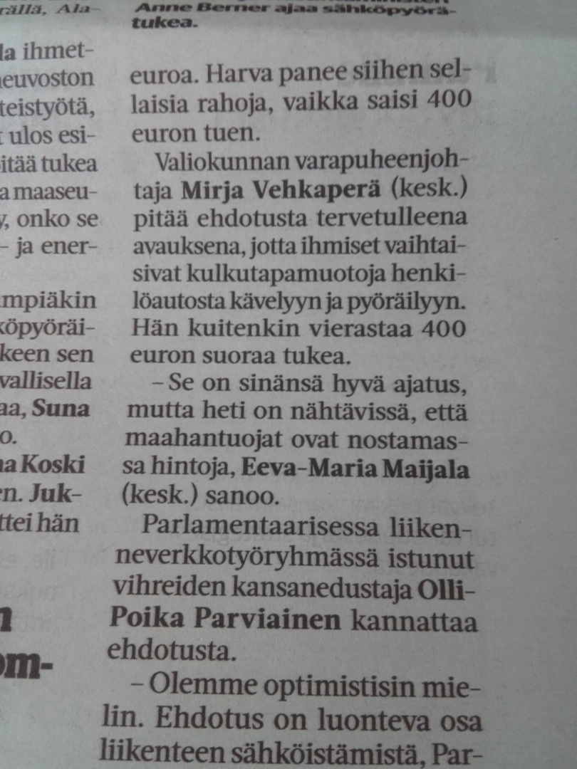 Tähän nimittäin liittyy erityinen näkökulma, joka nousee esiin vasta kun tuo "avokätinen" tuki on ollut voimassa ja suomalaiset oikeasti ostavat sähköpyöriä. Pyöräily lisääntyy ja pyöräily saa massojen poliittista arvoa ja kykenee pitämään puolensa myös kalliimmissa rahanjakovalinnoissa. Sähköpyörätuki on kuin tuulivoiman syöttötarifi, joka maksaa, mutta tuottaa säästöinä moninkertaisesti hintansa takaisin*. Eihän tuo 400 € vaikka jokaisen auton satunaiseksikin korvaajaksi ole liikenneinvestointina, jona se tietenkin pitää nähdä, kuin muutaman silta- tai tunneliprojektin kustannus. Tuen aiheuttamalla muutoksella liikennevirroissa saavutettaisiin hyötyä keventyneenä liikennekuormana ja ympäristöhyötyinä kaikissa kaupungeissa ja ennen kaikkea liikenneinfran muutospaineena kevytväylien parantamiseksi.