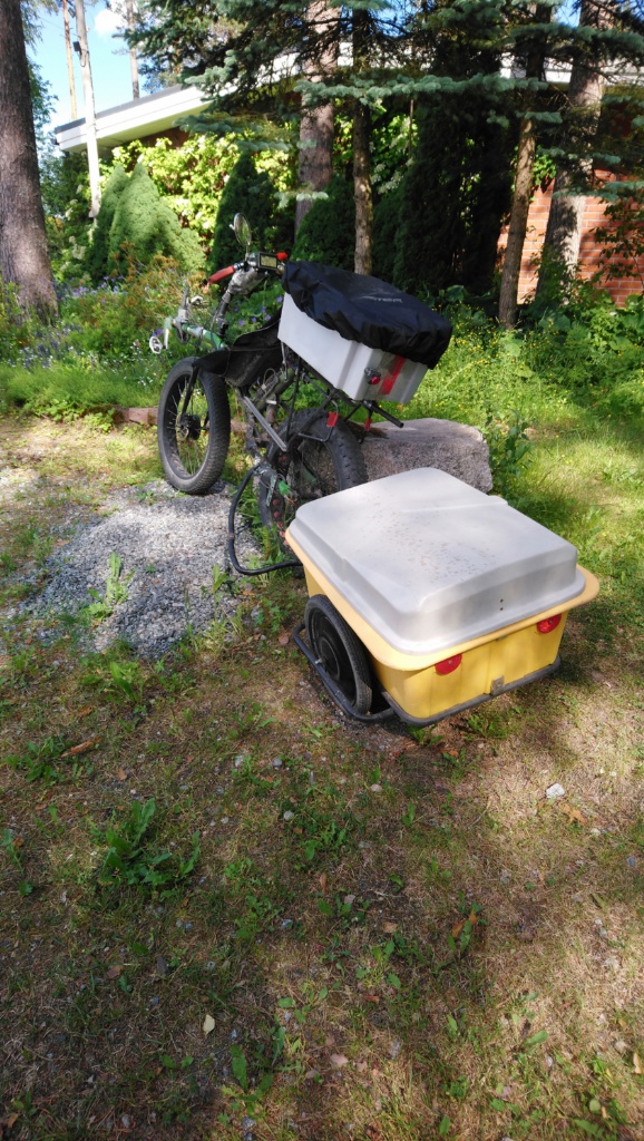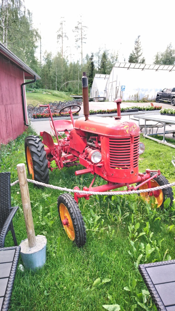 Tein kärryyn uuden vetoaisan ja poljeksin koeajolla 12 km päässä olevalle puutarhalle joka on samalla Sailan työmatkan varrella. Pullakahvit ja muutamat yrtit ostimma. Hienoja traktoreita siellä aina ihastelee.