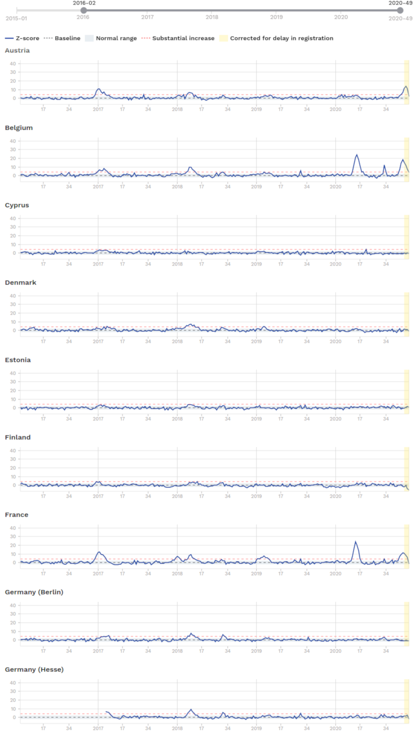 Kuolleisuusluvuissa on joissain maissa piikkejä ylös päin viime maaliskuun kohdalla, mutta esim. suomessa ei mitään piikkiä mihinkään suuntaan, vain lievää laskua. Erityisen mielenkiintoisia ovat Itävalta, jossa ei ole piikkiä viime keväänä, kun kaikki kuulemma saivat sieltä koronansa, mutta taas nyt on siellä kuolleisuus koholla.