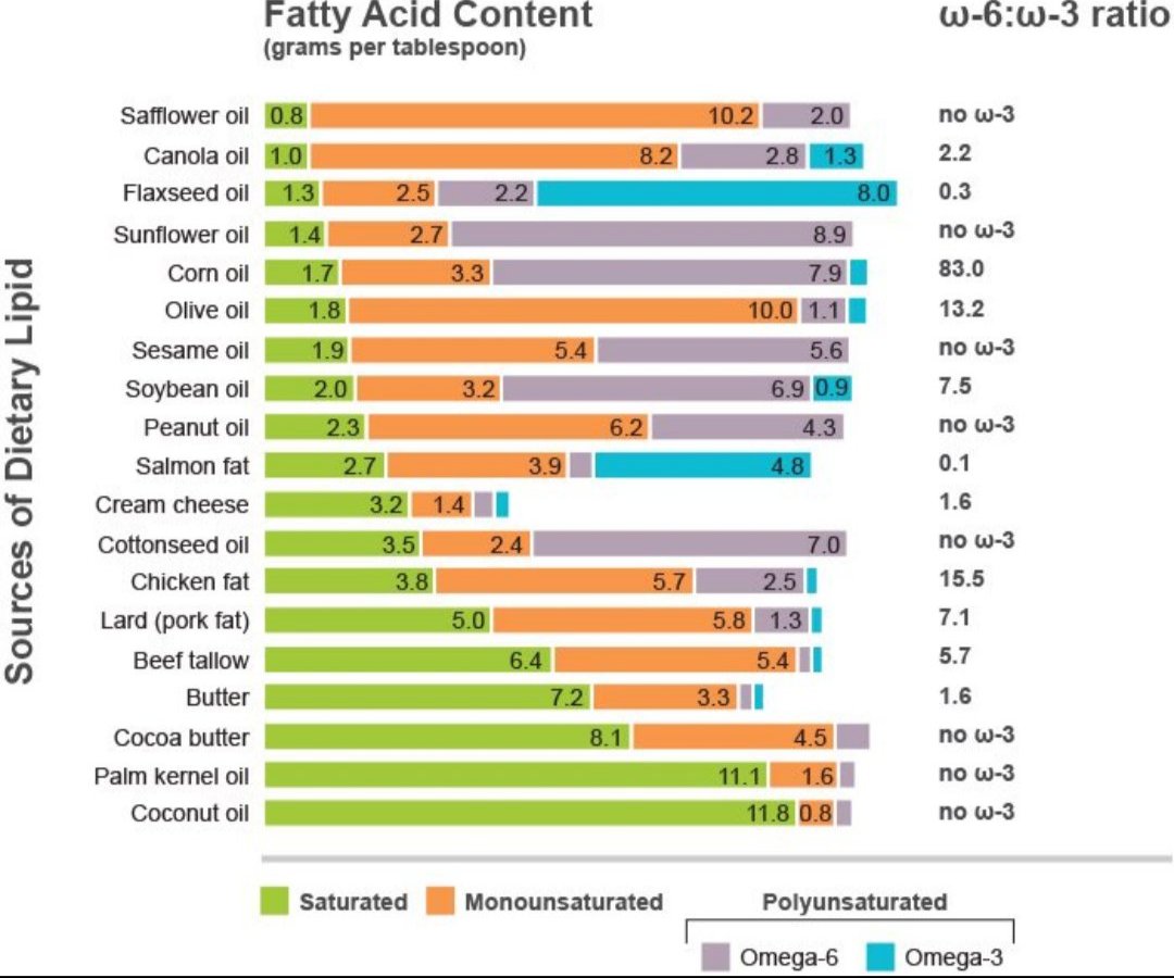 Edellisen elokuvan demonisoimat siemenöljyt löytyvät tästä grafiikasta helposti pitkän violetin palkin (omega 6) perusteella.