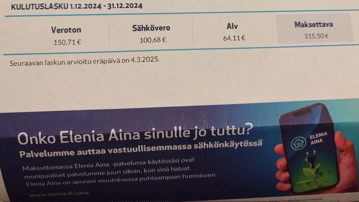 Kuva ei ole meidän sähkölaskusta, mutta siitä on helppo havaita, että sähkön kuluttajahintaan lisätään yli sata prosenttia veroa.![]()
