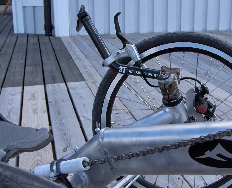Yksi mutu tuli tuossa vinon pinnan testissä mieleen: Mitähän vaikutusta on sillä että laitoimme vasemman puolen jarrun ohjausakselin etupuolelle (vaijerin veto helppoa) ja oikea jarru on akselin takapuolella. Mitä pikaisesti tsekkasin kaupallisia tuotteita niin niissä oli poikkeuksetta molemmat jarrut ohjausakselien takapuolella. Testissä tuntui että kääntyminen vasemmalle alamäkeen oli voimakkaampaa. Täytyy kokeilla jos sitä jarrua saa siirrettyä.
