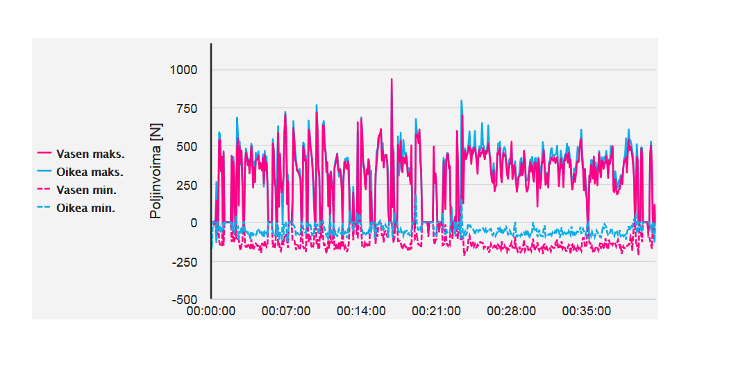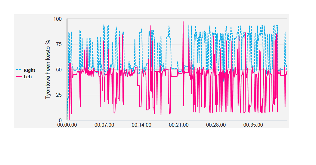 Erityisesti tuossa työntövaiheen kesto käppyrässä näyttäsii olevan iso ero jalkojen välillä, vasen ei muka tekesi työtä oikeaan suuntaan läheskään yhtä paljon kuin oikea. Maksimi poljinvoimat näyttäisivät olevan molemmilla jaloilla hyvin samalla tasolla, mutta minimivoima olisi vasemmalla aika paljon isompi.