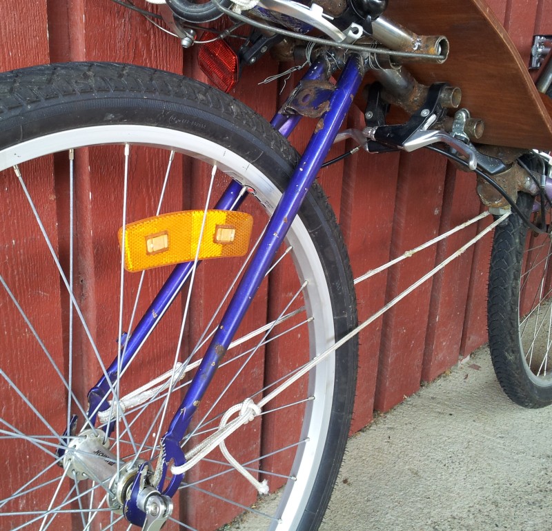 Niinhän se on, kun kaikki on hyvin, Kun nyt sitten kuitenkin tulee takapyörälle ohjauskulmaa löysän tuennan takia lokasuojalanka kääntyy narulinjalta sivulle ja tukee paremmin, kuin vain suoraan vetävä naru. Sitäpaitsi lokasuojalanka toimii normaalitilanteessa aivan kuten narukin.